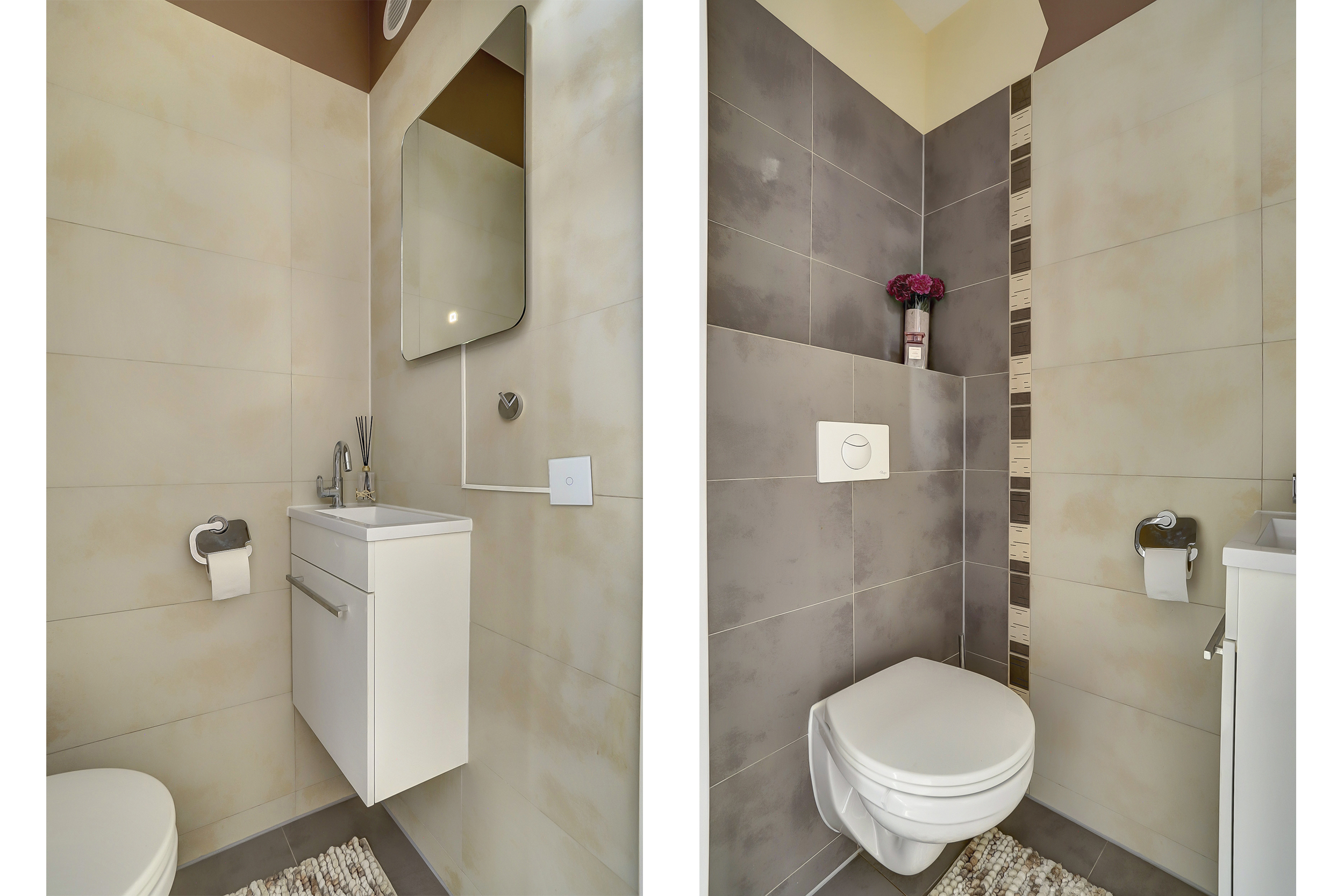 Betegelde toiletruimte met een fonteintje en een zwevend closet met muurspoeling.