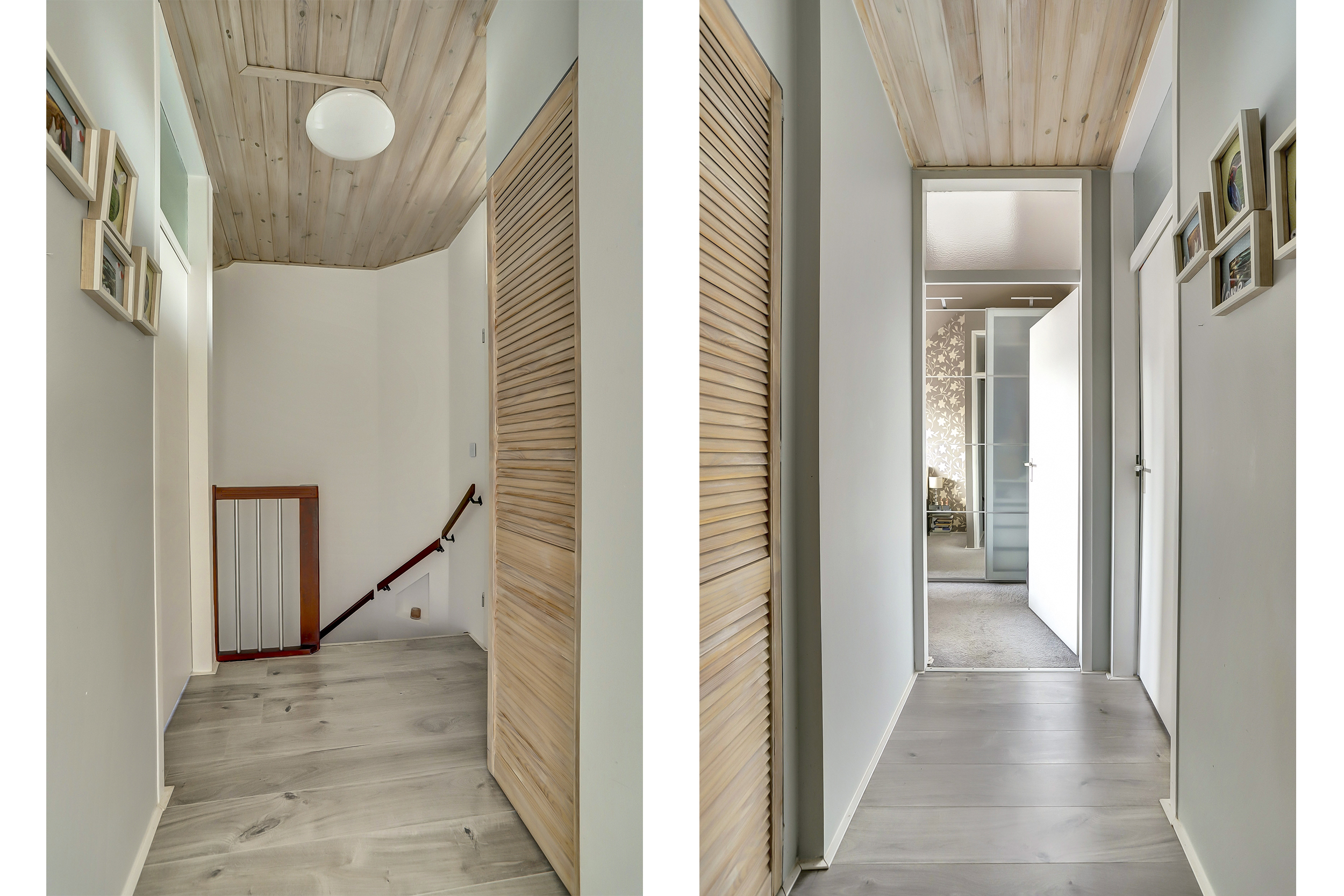 Overloop afgewerkt met een laminaatvloer, stucwerk wanden en een houten delen plafond.