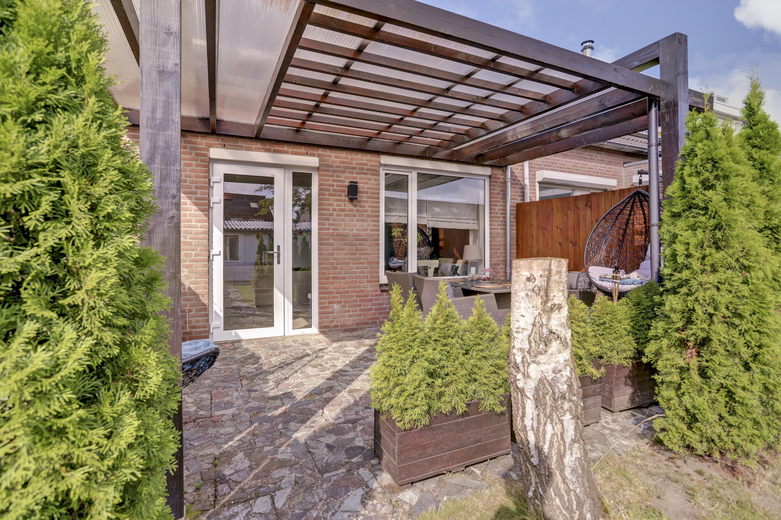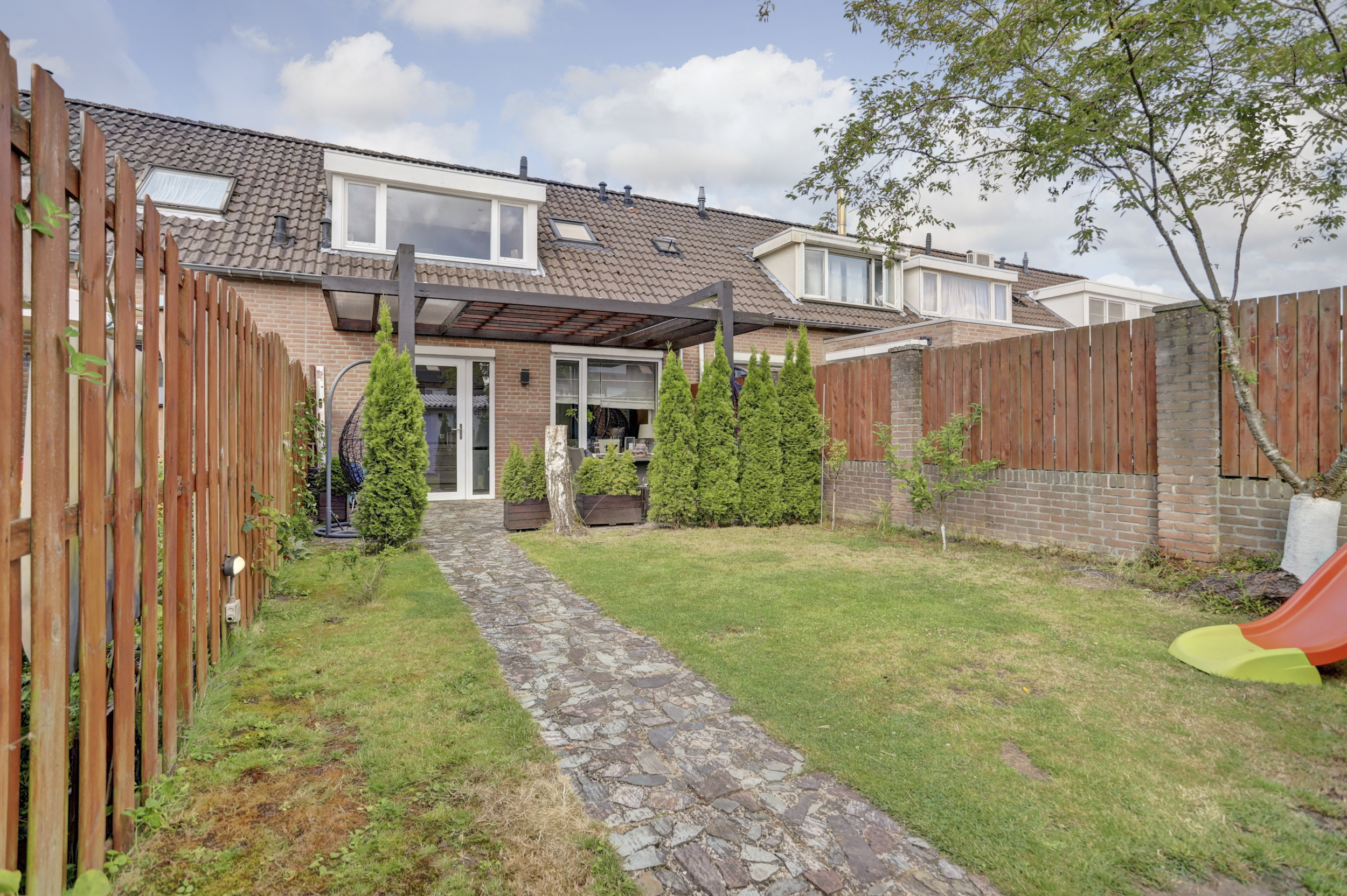De achtertuin met een afmeting van (12.00 meter x 5.80 meter) is fraai aangelegd met een houten delen erfafscheiding, mooie terrasoverkapping, verharde terrassen, beplanting en een gazon.