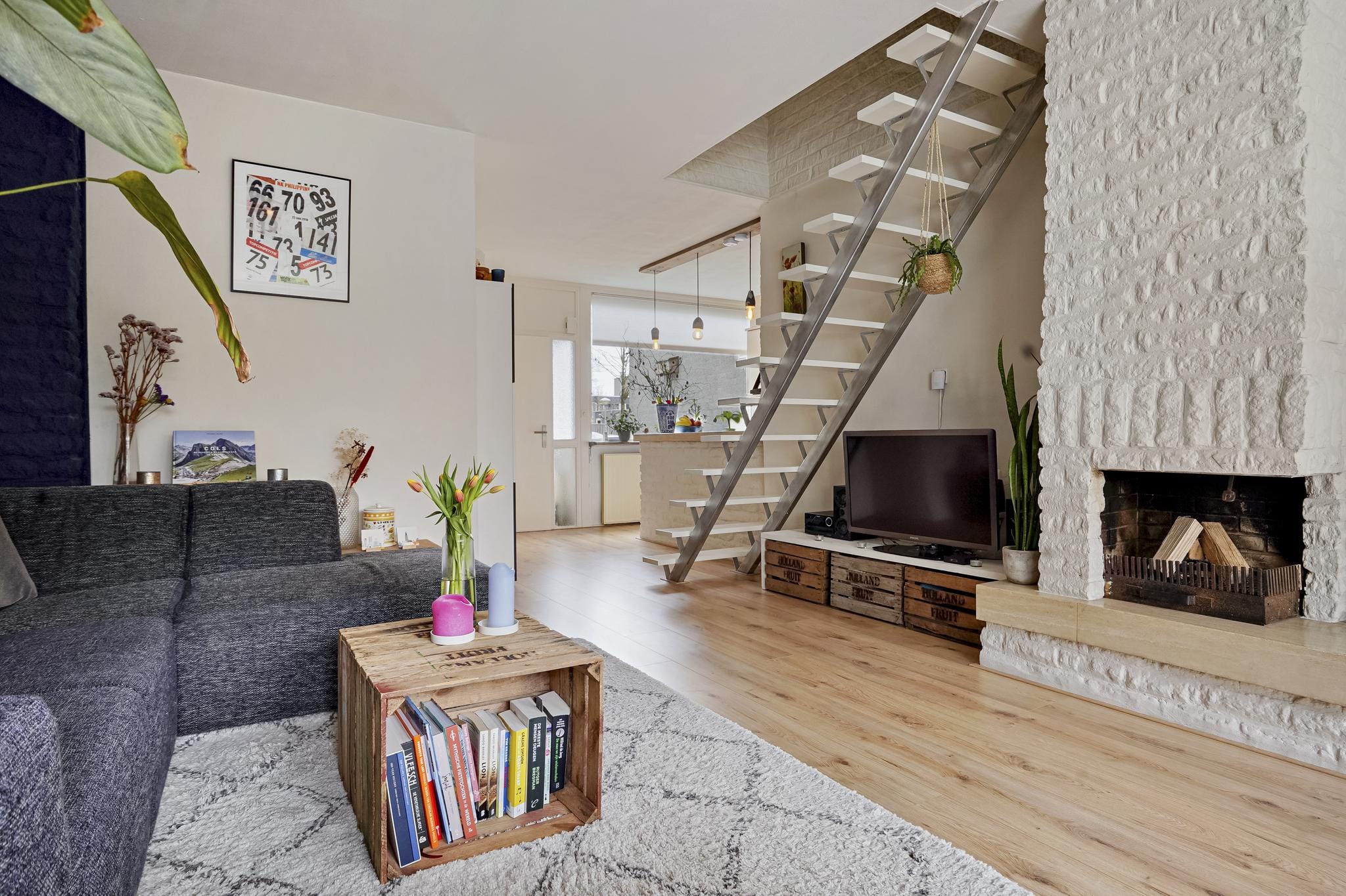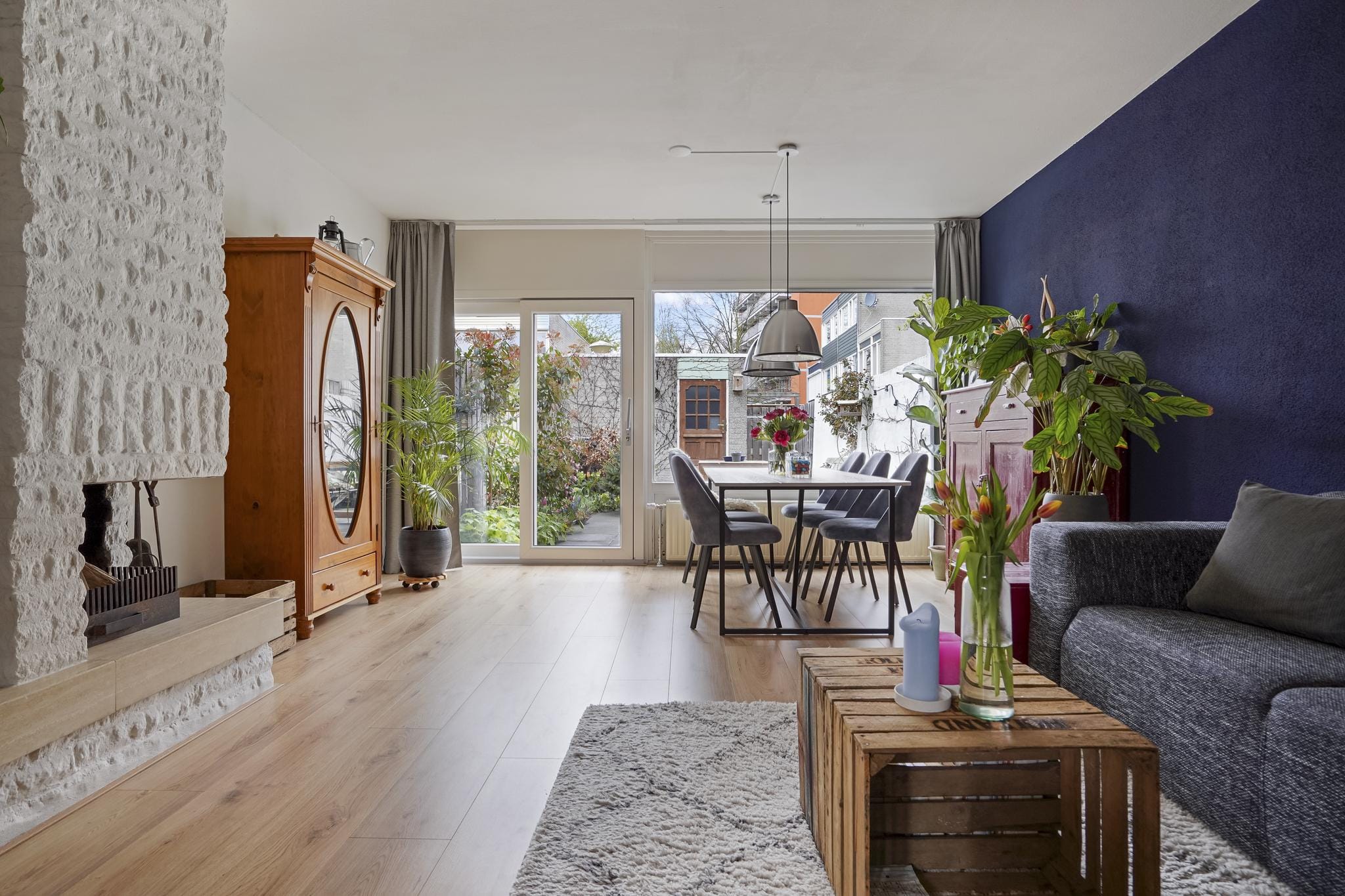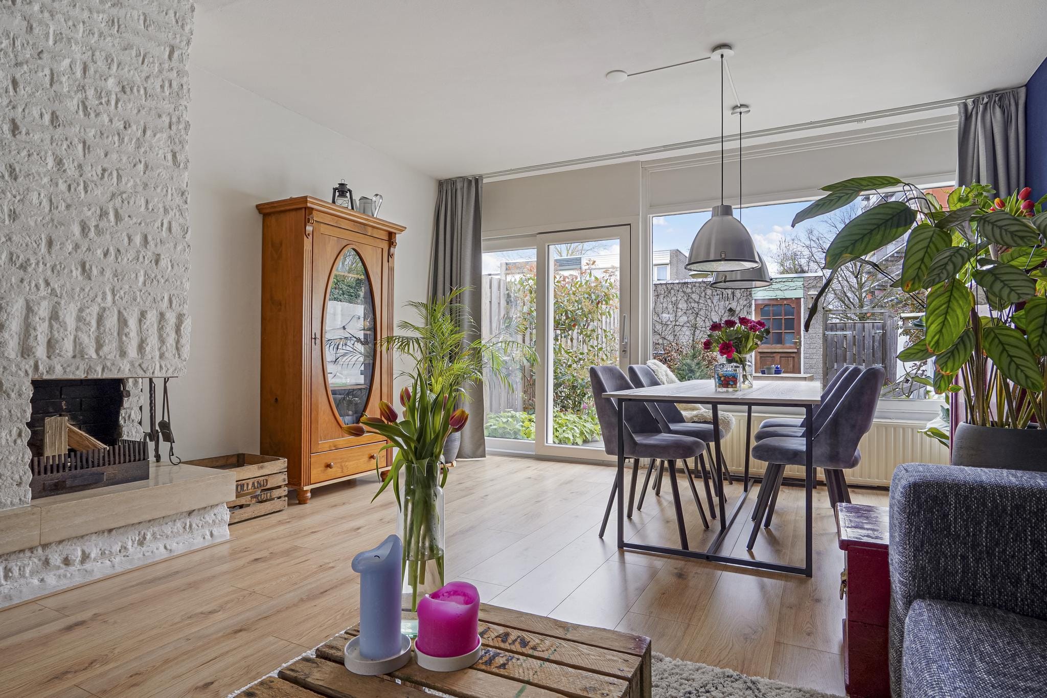 De sfeervolle gezellige tuingerichte living met schuifpui en openhaard-partij is afgewerkt met een lichte tegelvloer, stucwerk wanden en een wit spuitwerk plafond.