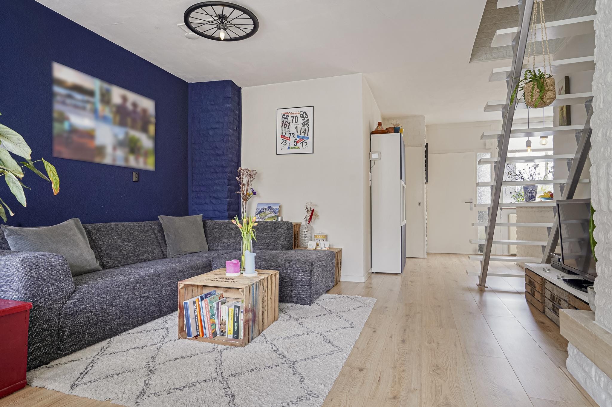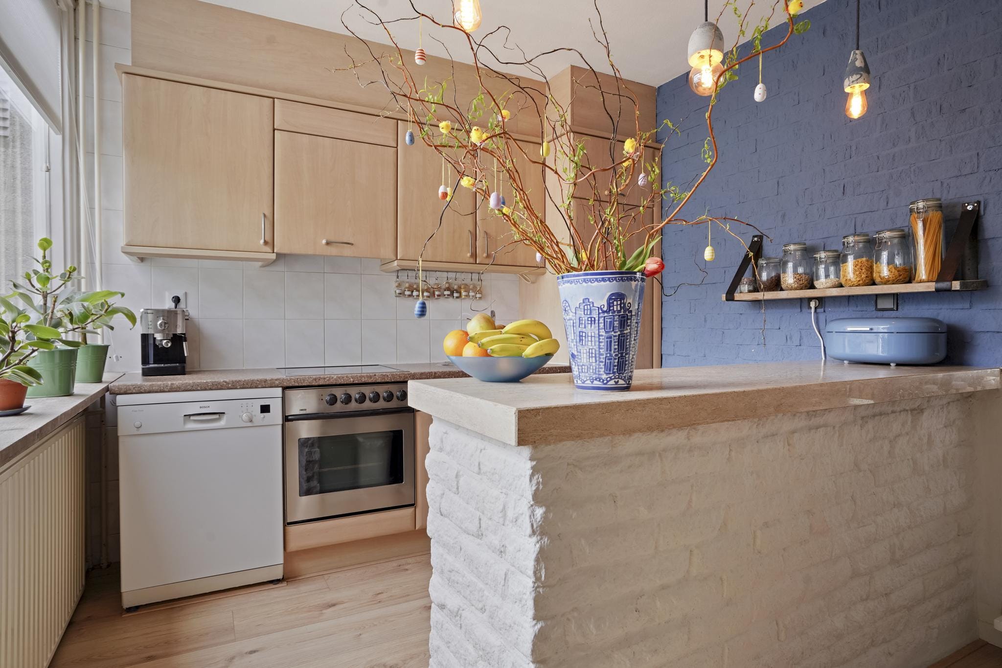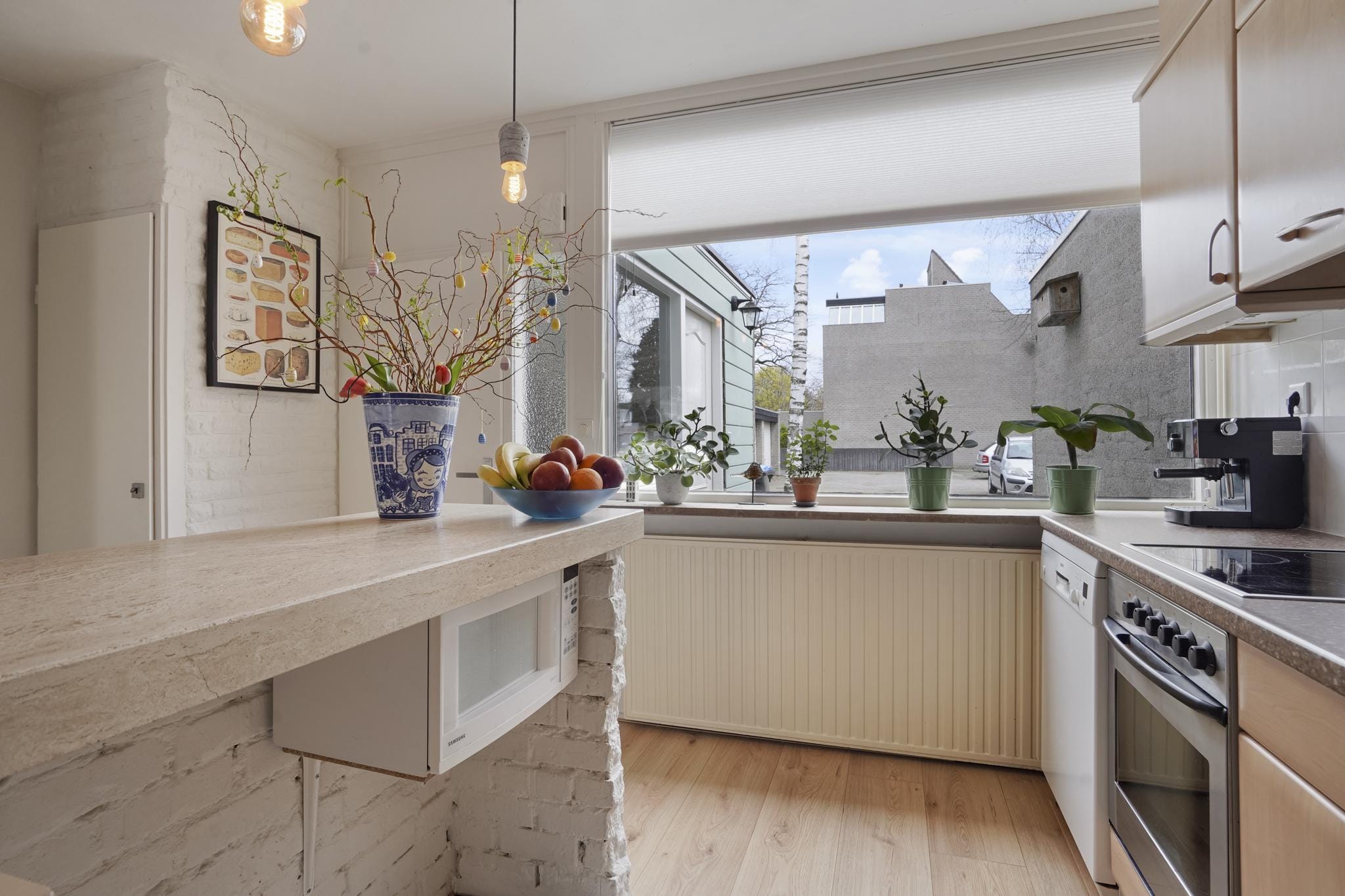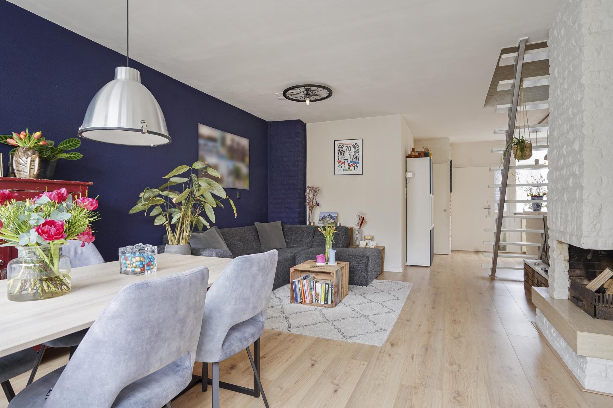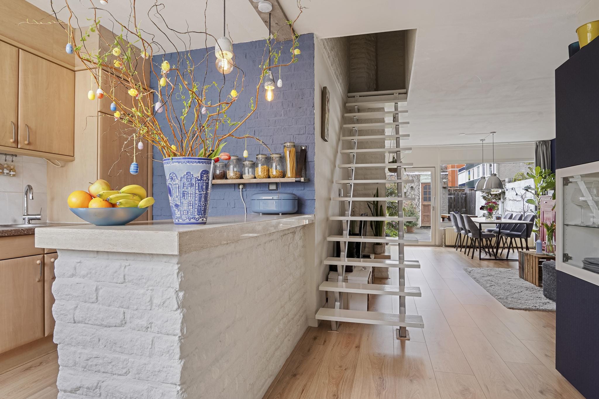 Deze ruimte heeft ook een gezellige eetbar die een scheiding vormt met de woonkamer.