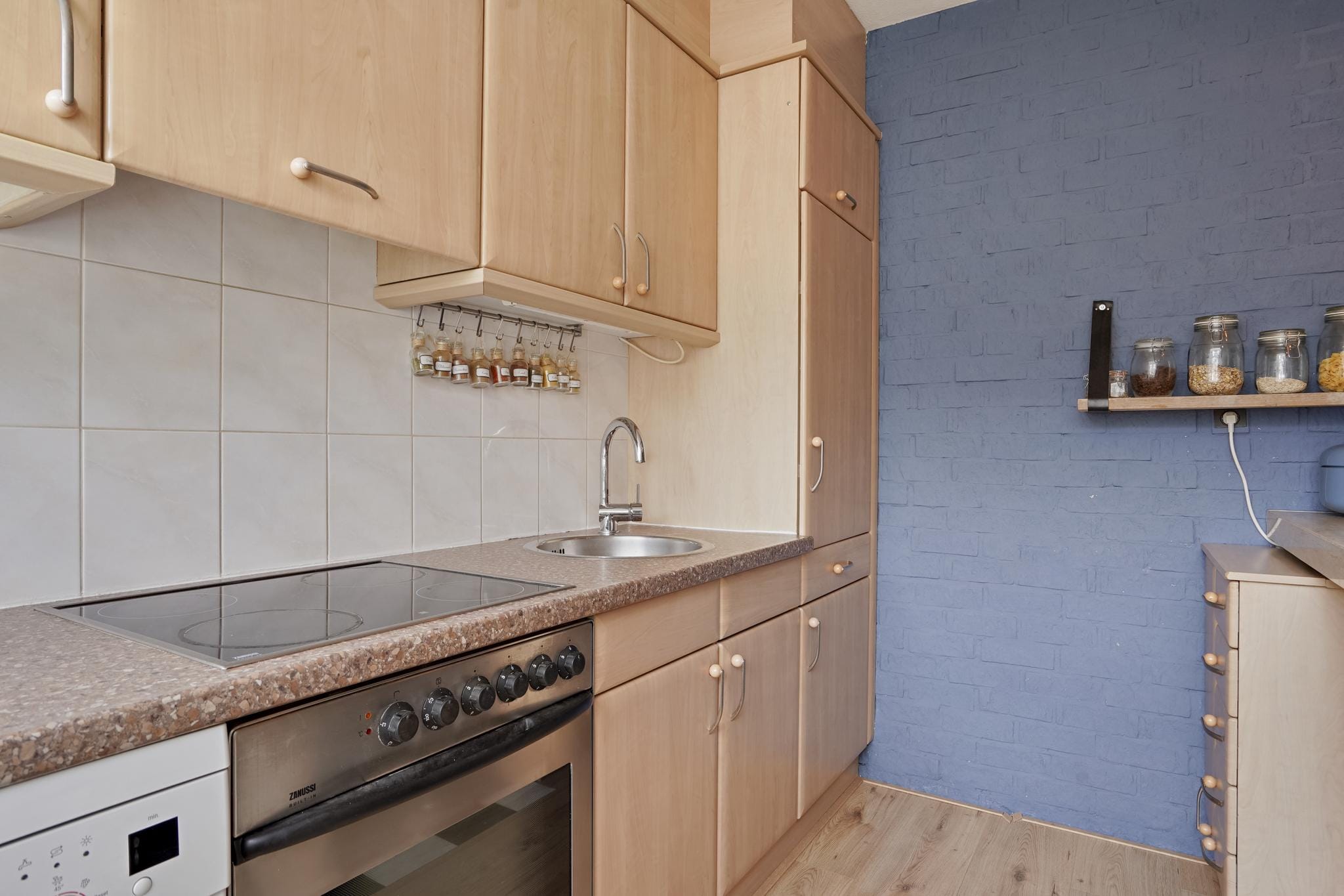 Open keuken ingericht met een praktische keukeninrichting voorzien van diverse laden en kasten, rvs spoelbak, koelkast, elektrische oven, vaatwasmachine, elektrische kookplaat en een afzuigkap.