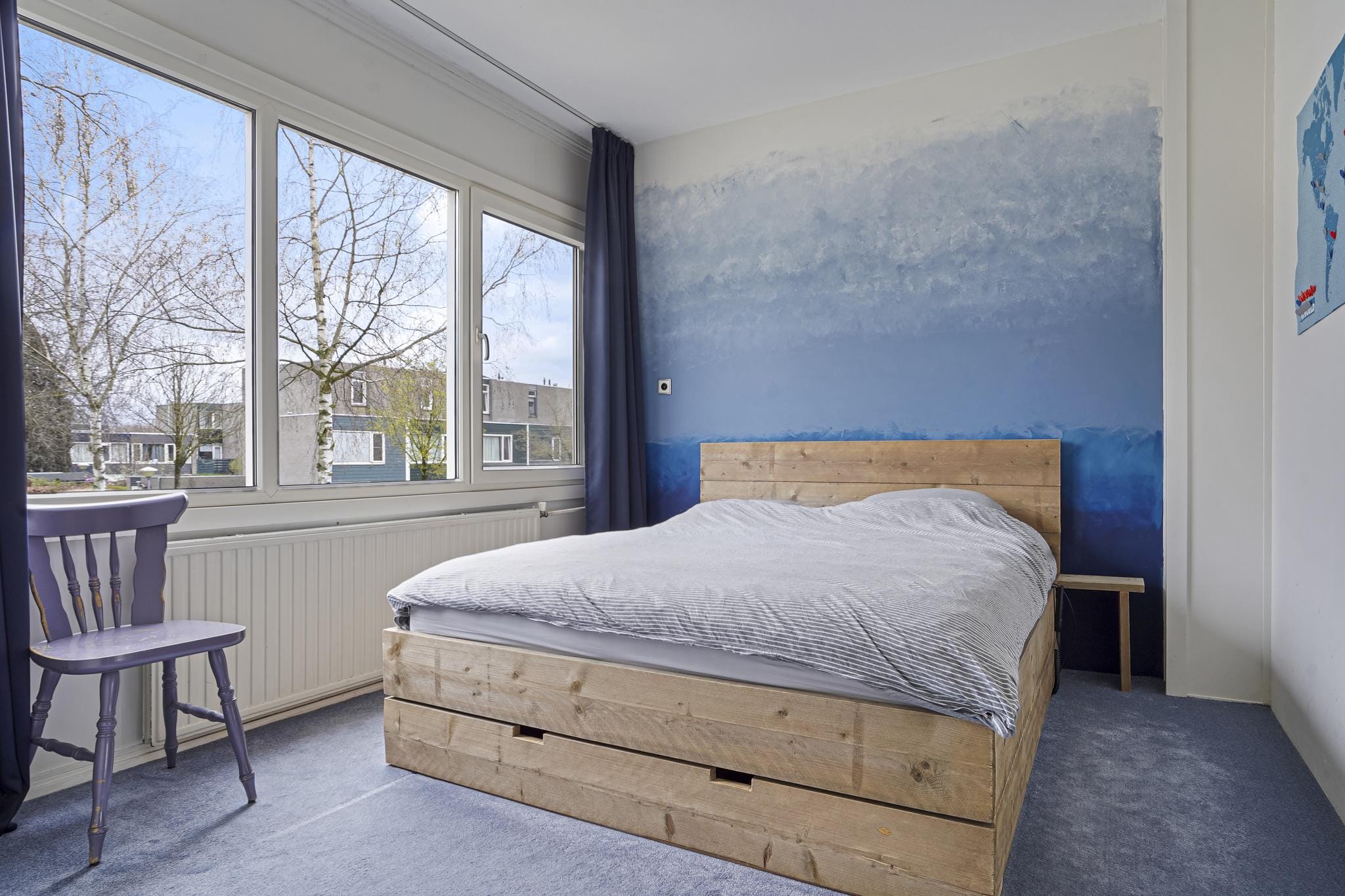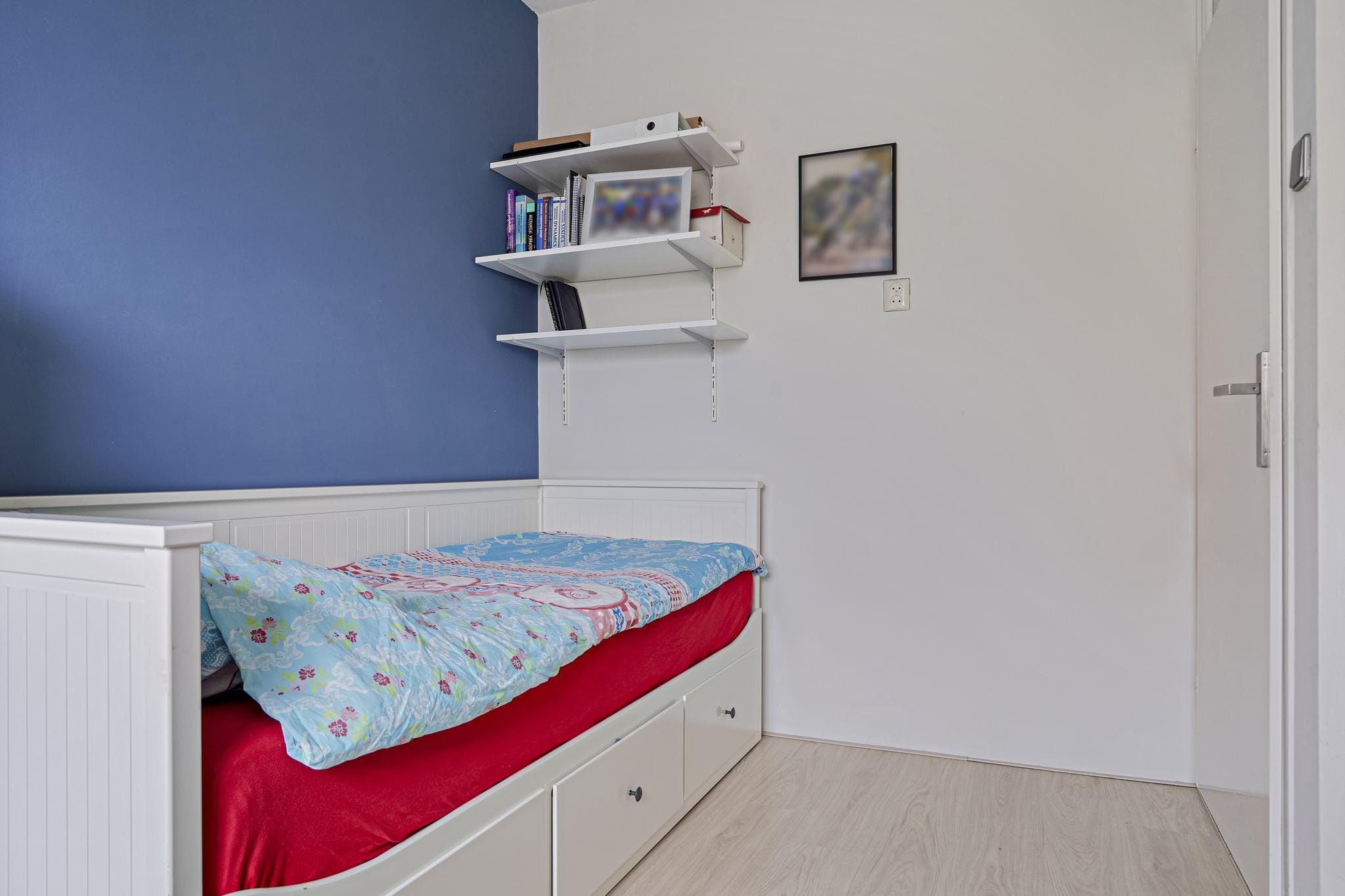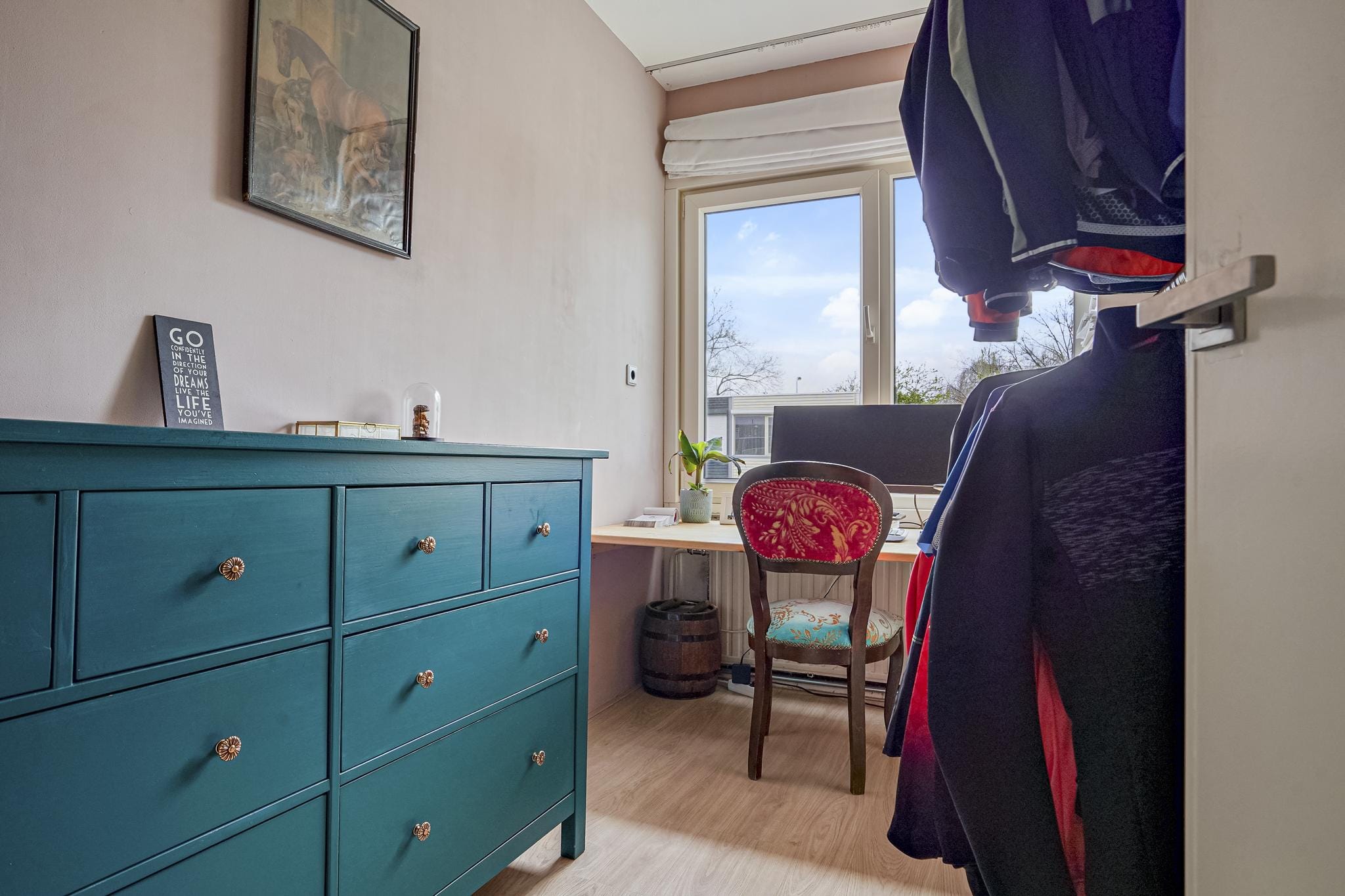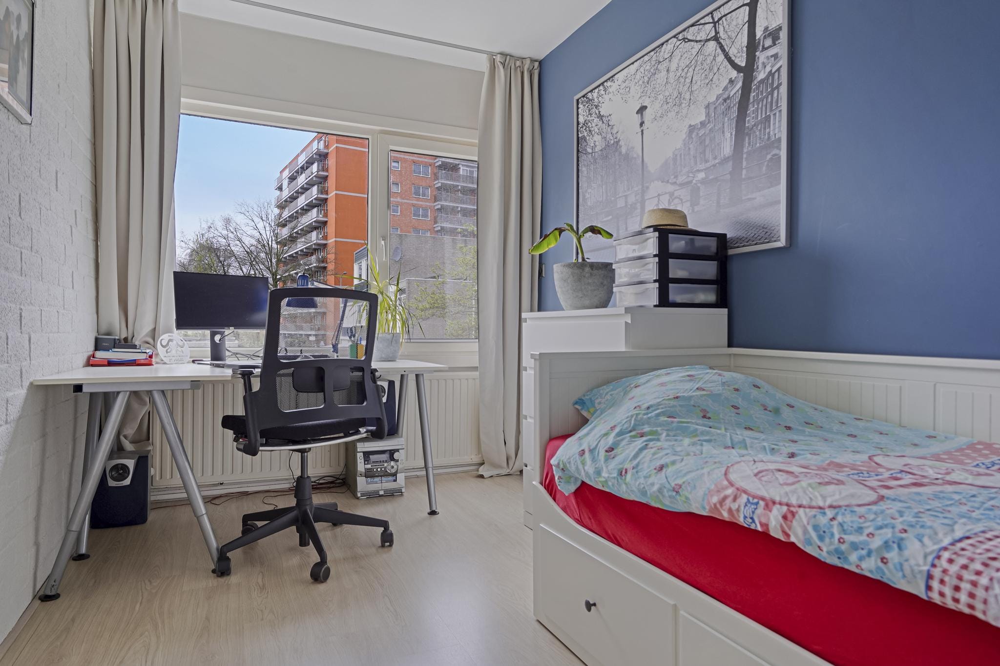 Slaapkamer 3 aan achterzijde is afgewerkt met een lichte laminaatvloer, stucwerk deels metselwerk wanden en een licht structuur plafond.