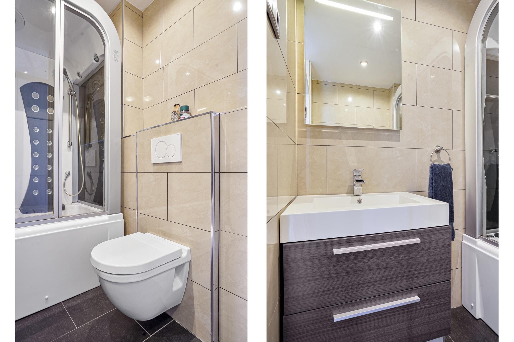 De eigentijdse nette badkamer is afgewerkt met een tegelwerk vloer en tegelwerk wanden. De voorzieningen bestaan uit een badmeubel met geïntegreerde wastafel, zwevend closet met muurspoeling en een wellness combinatie van een ligbad/douche gecombineerd met stoomcabine en jetstream massage.
