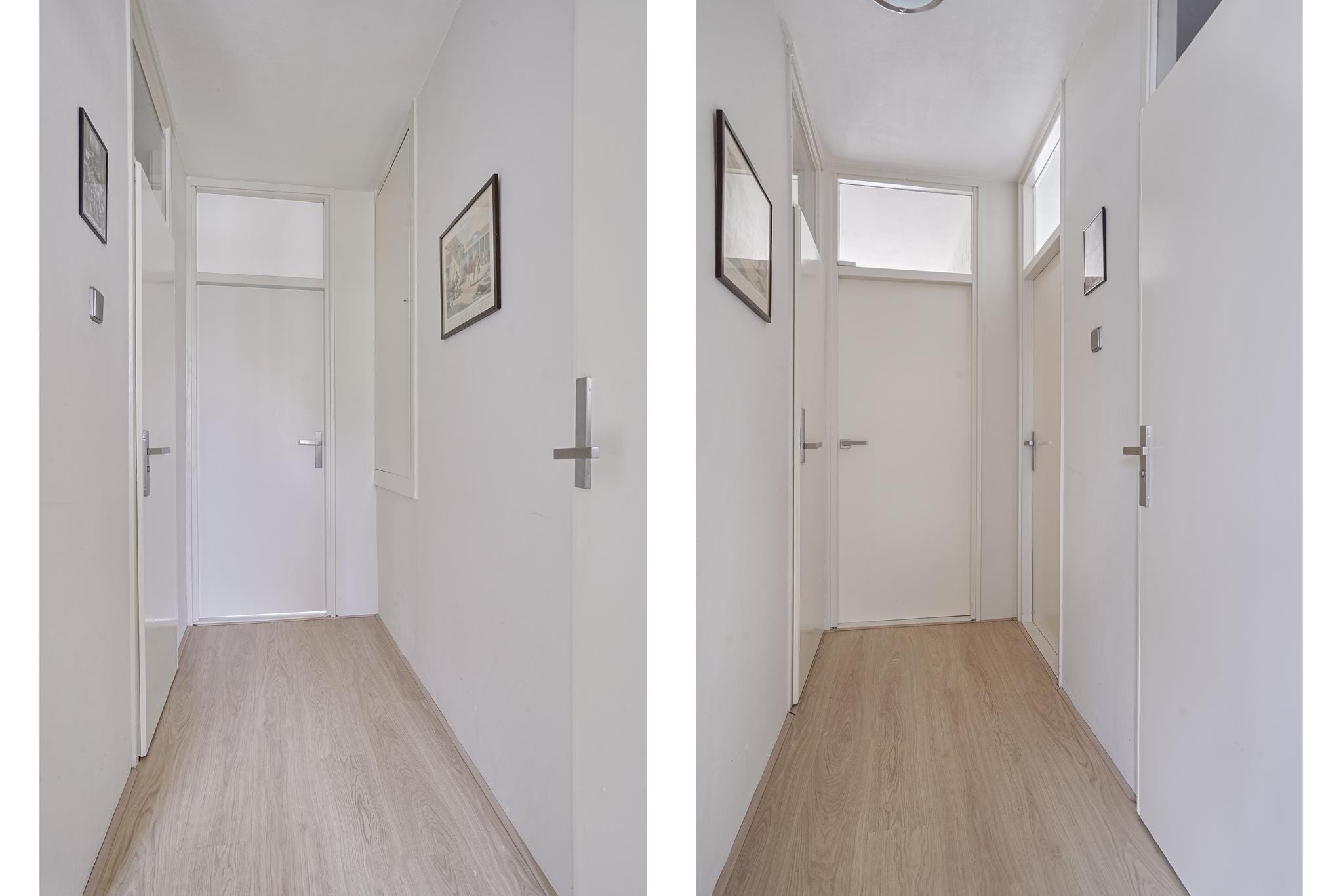 Overloop afgewerkt met een laminaatvloer, stucwerk wanden en een spuitwerk plafond.