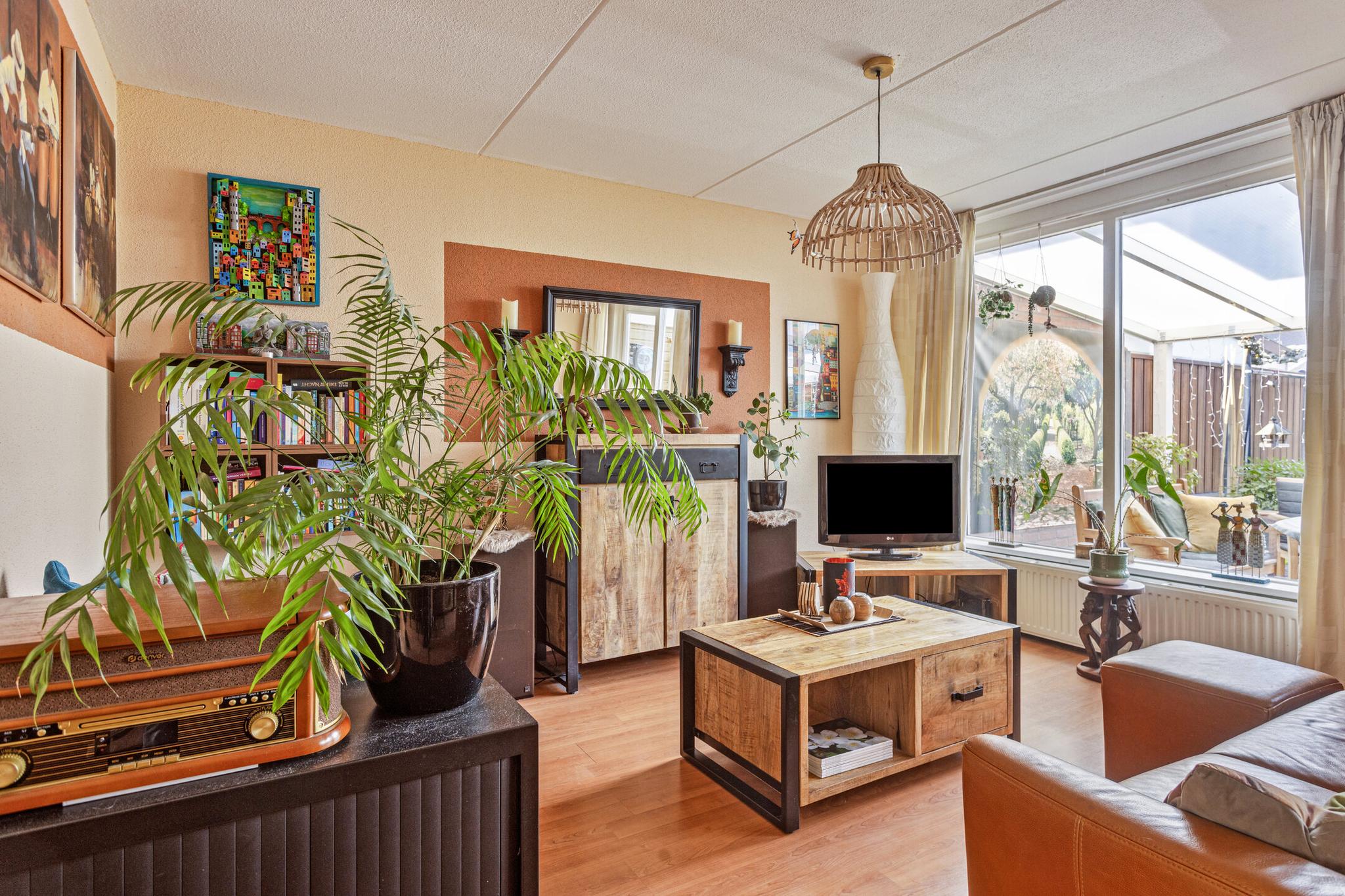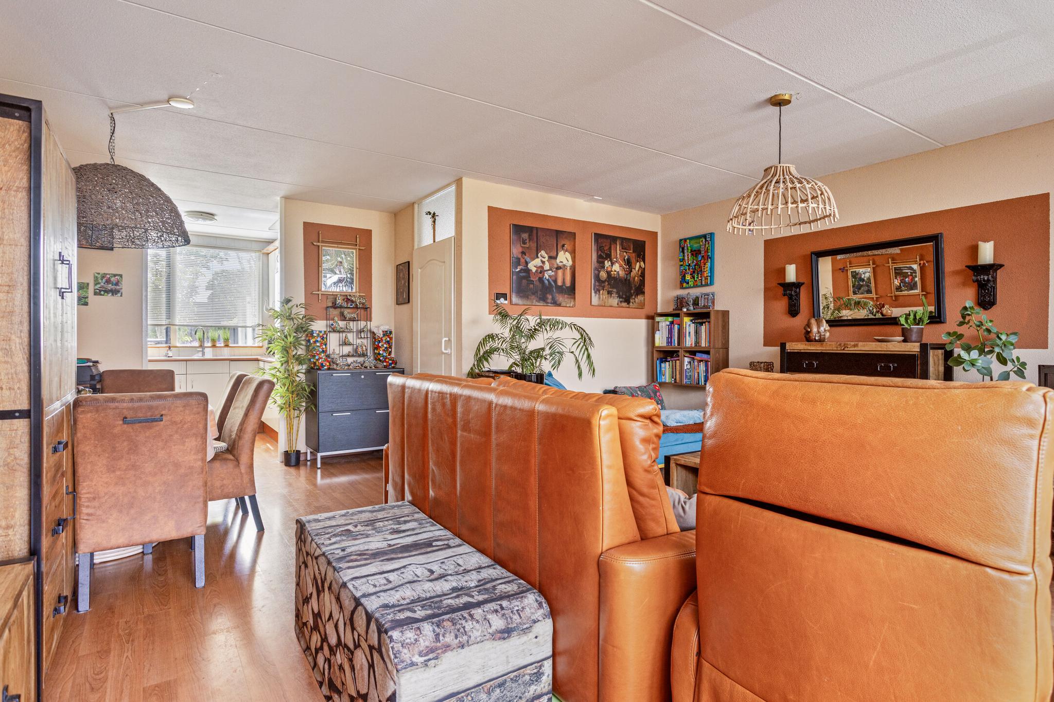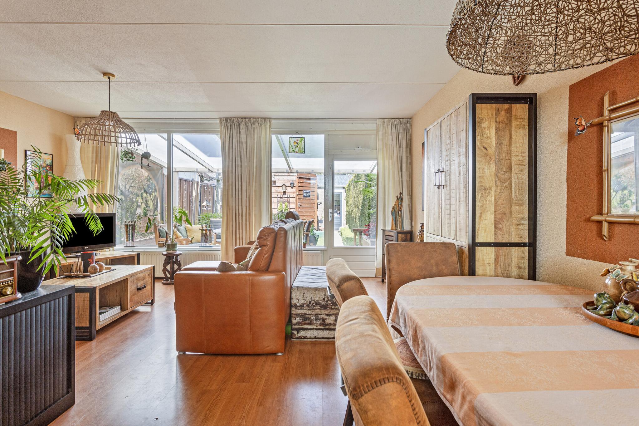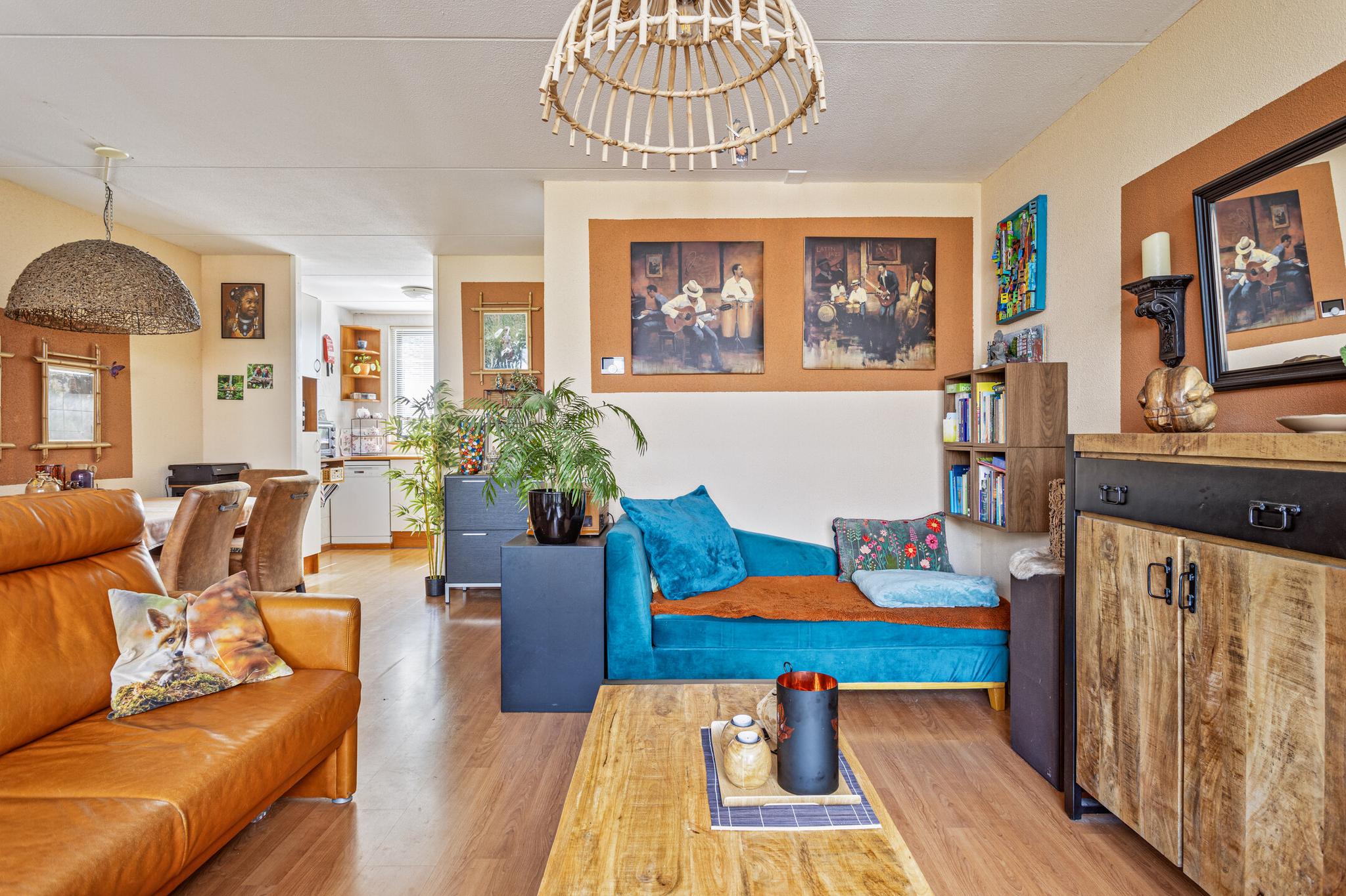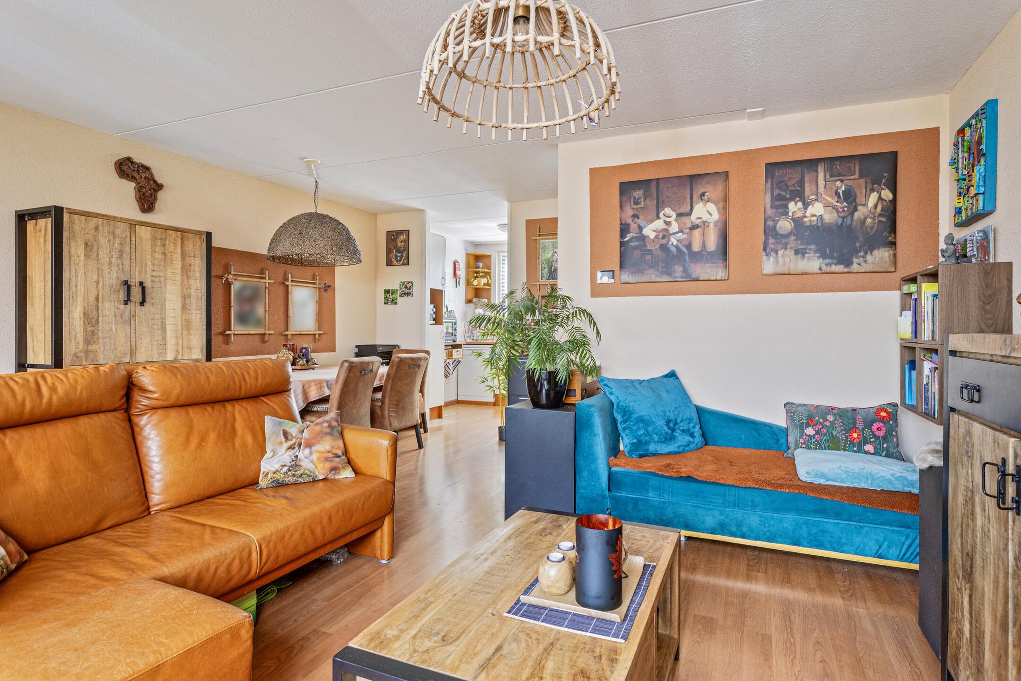De sfeervolle woonkamer is afgewerkt met een laminaatvloer, spuitwerk wanden en een spuitwerk plafond.
