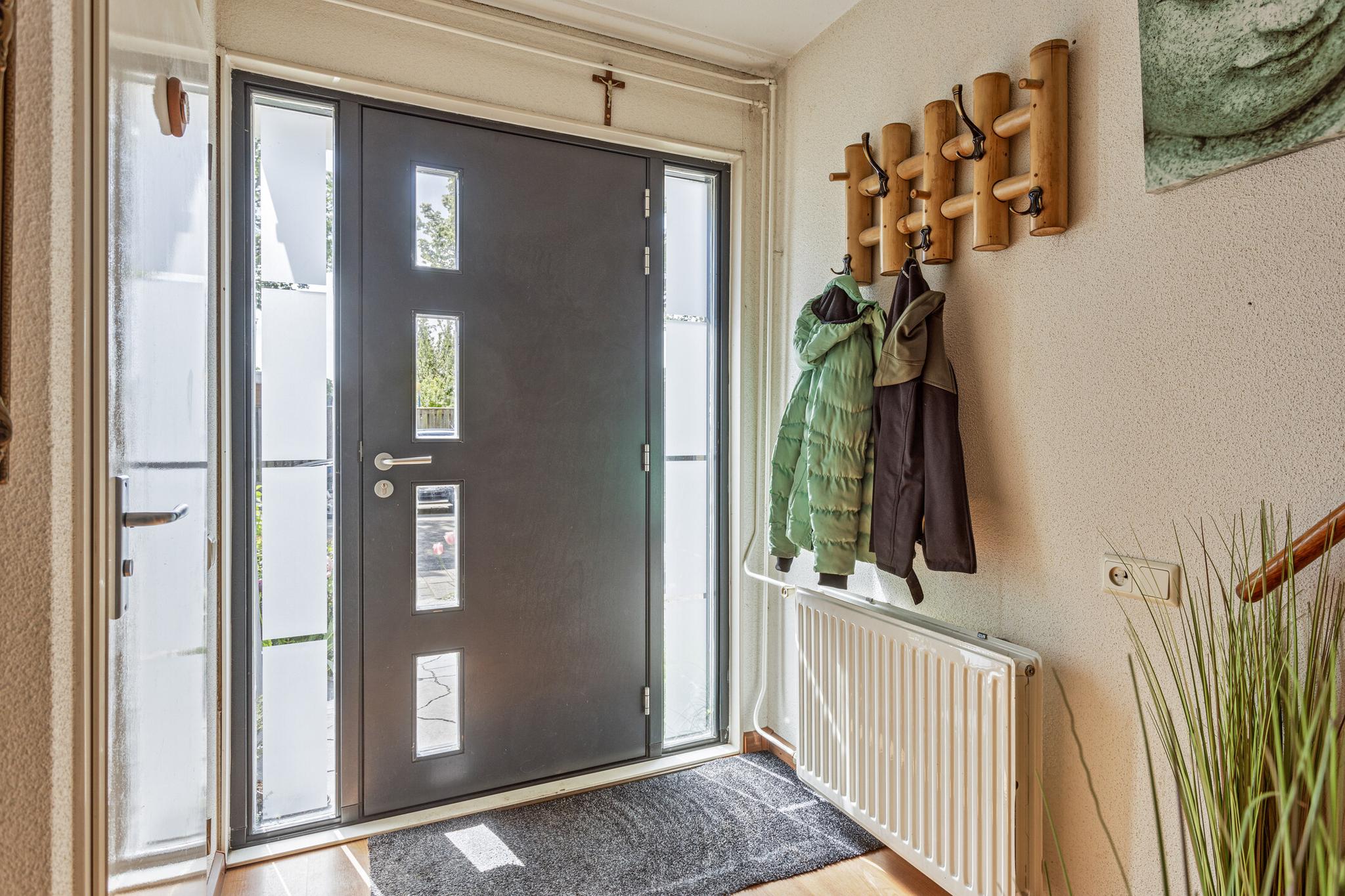 Overdekte entree met een nieuwe hardhouten voordeur voorzien van 5 punts sluiting.