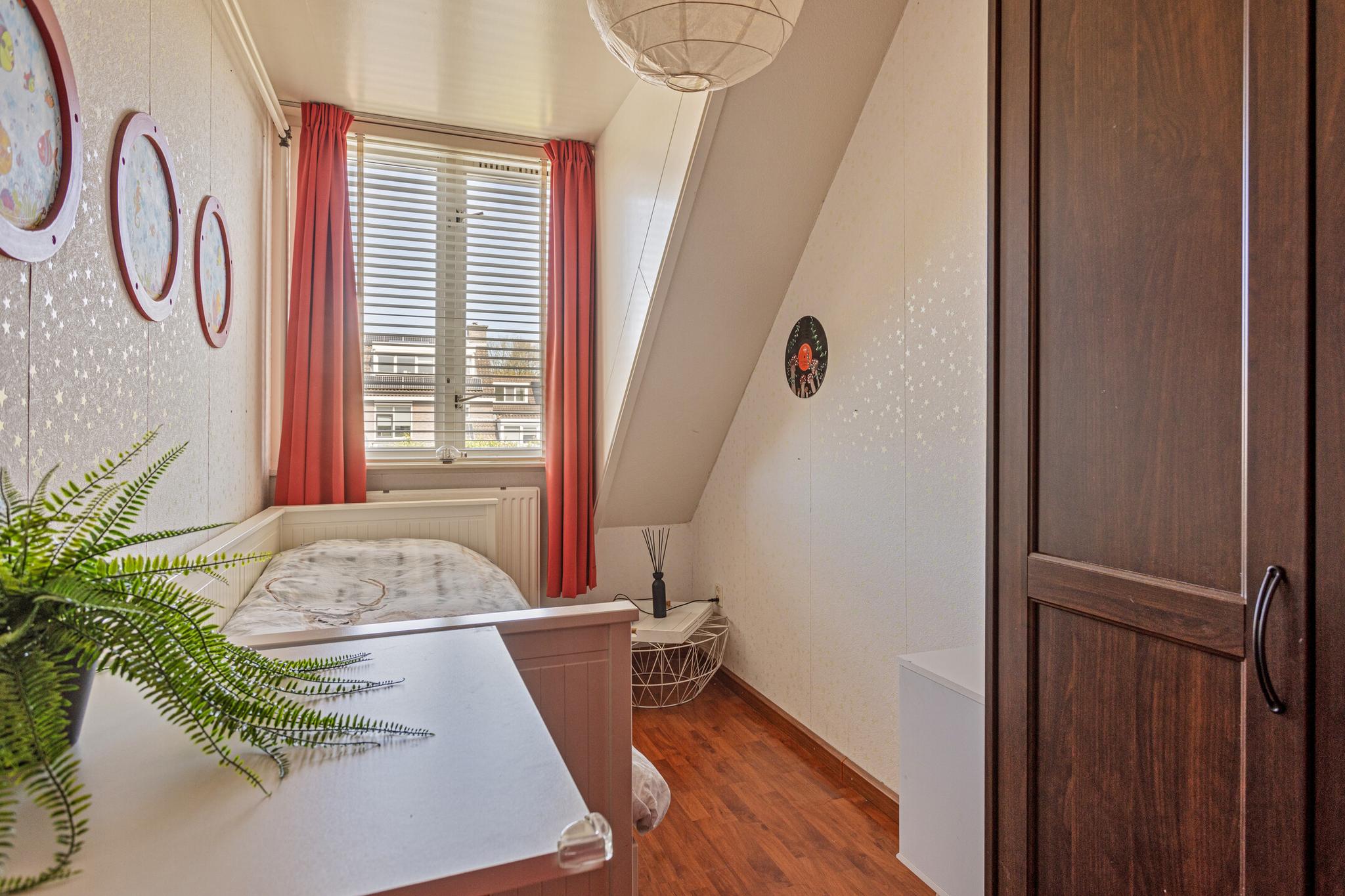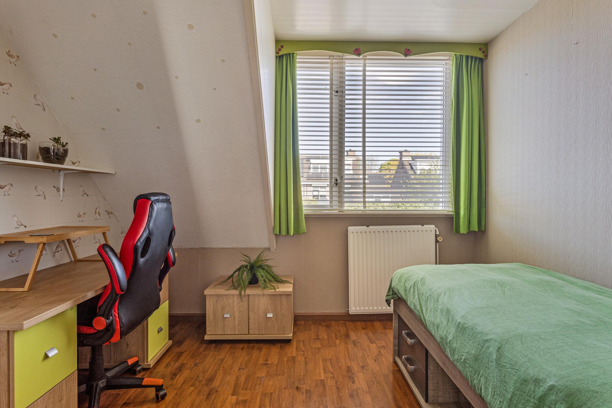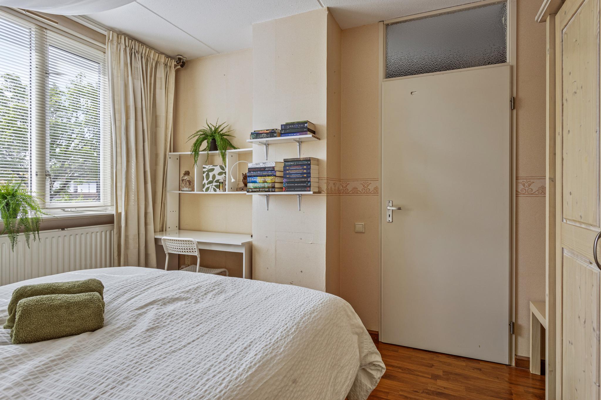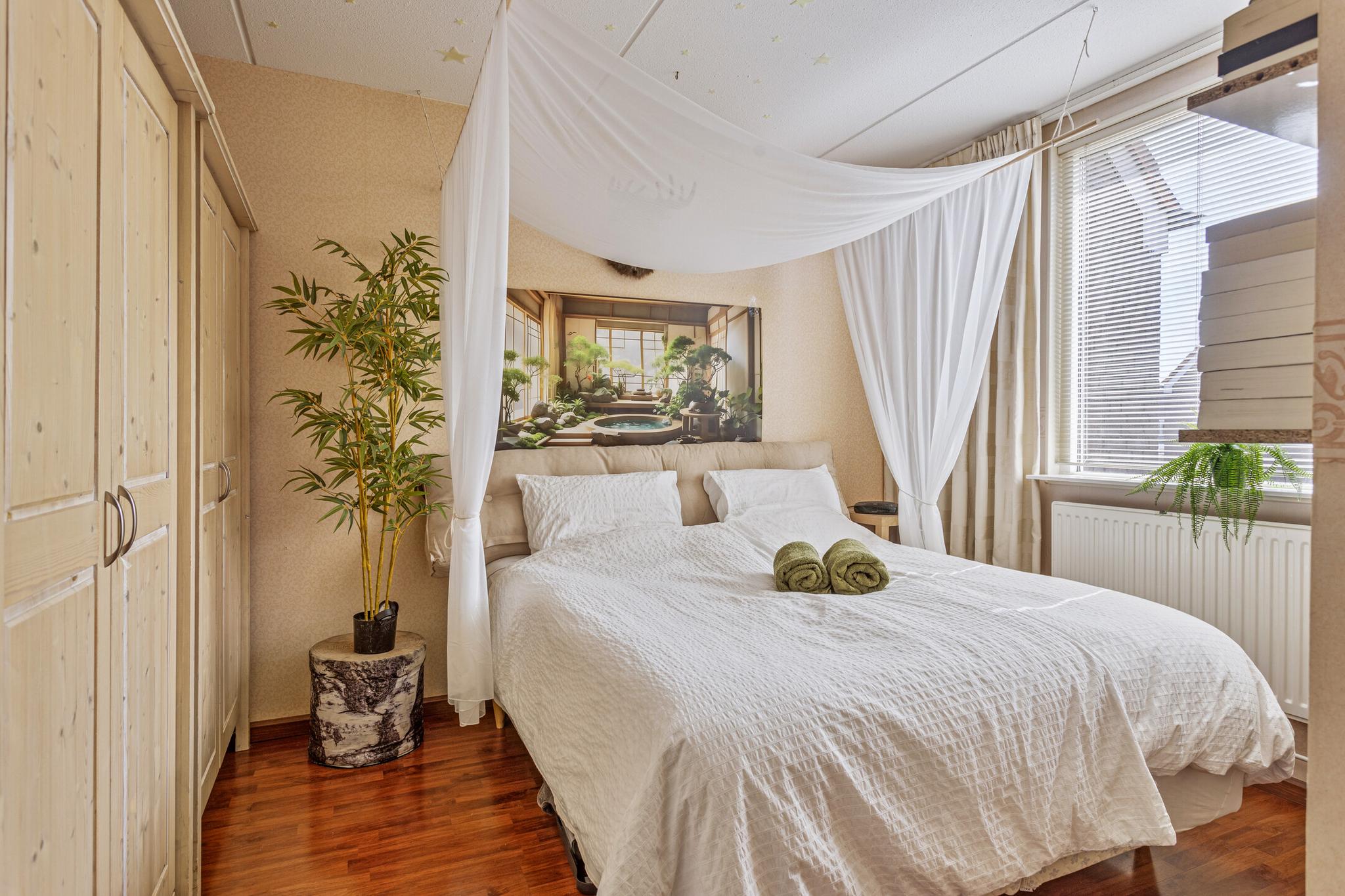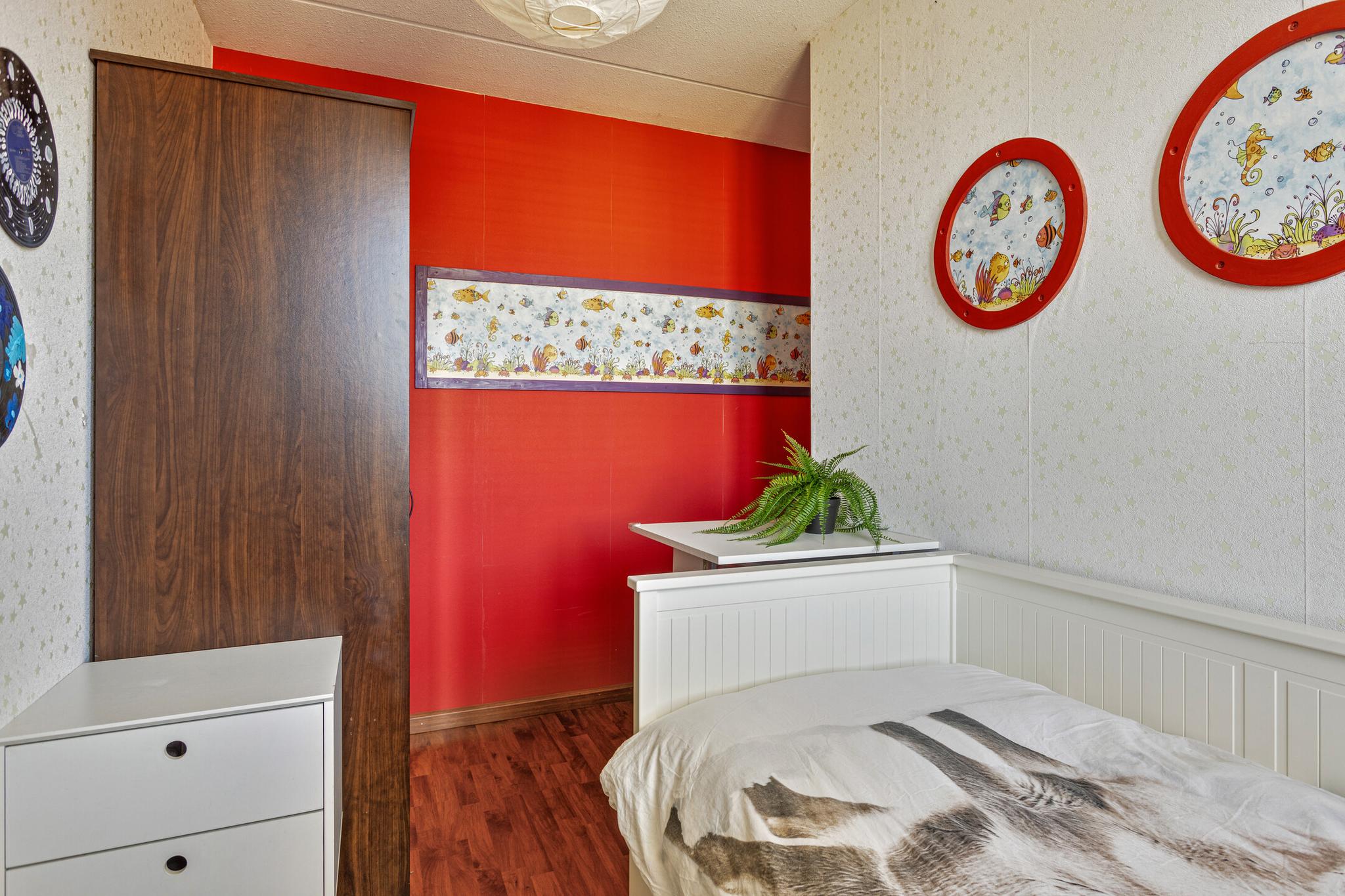 Slaapkamer 2 aan achterzijde is afgewerkt met een laminaatvloer, behangen wanden en een spuitwerk plafond.