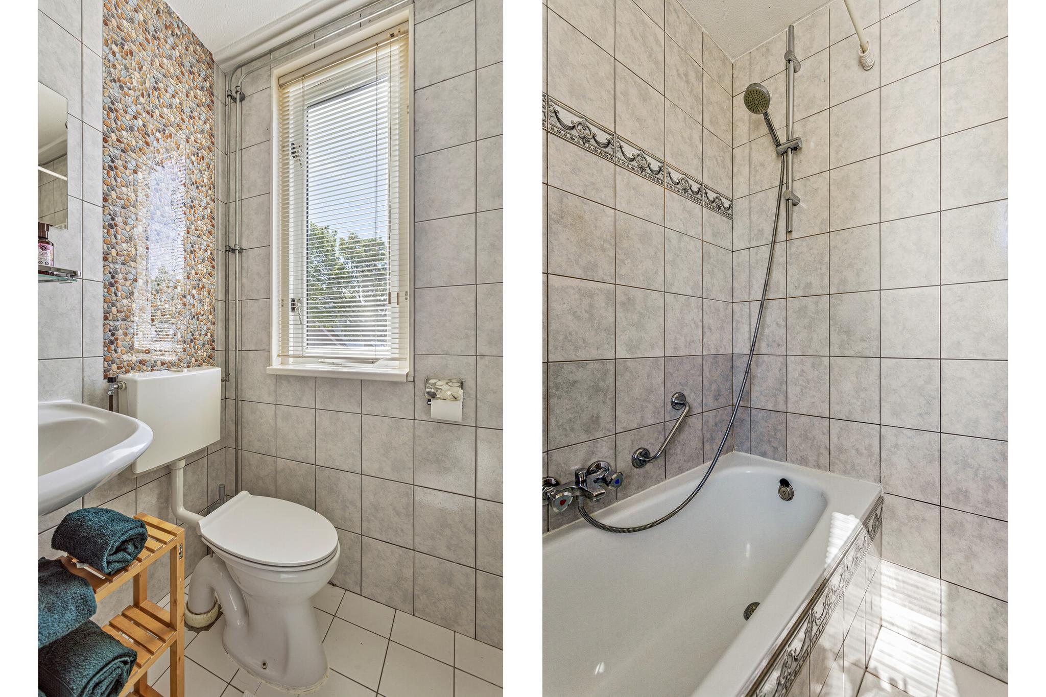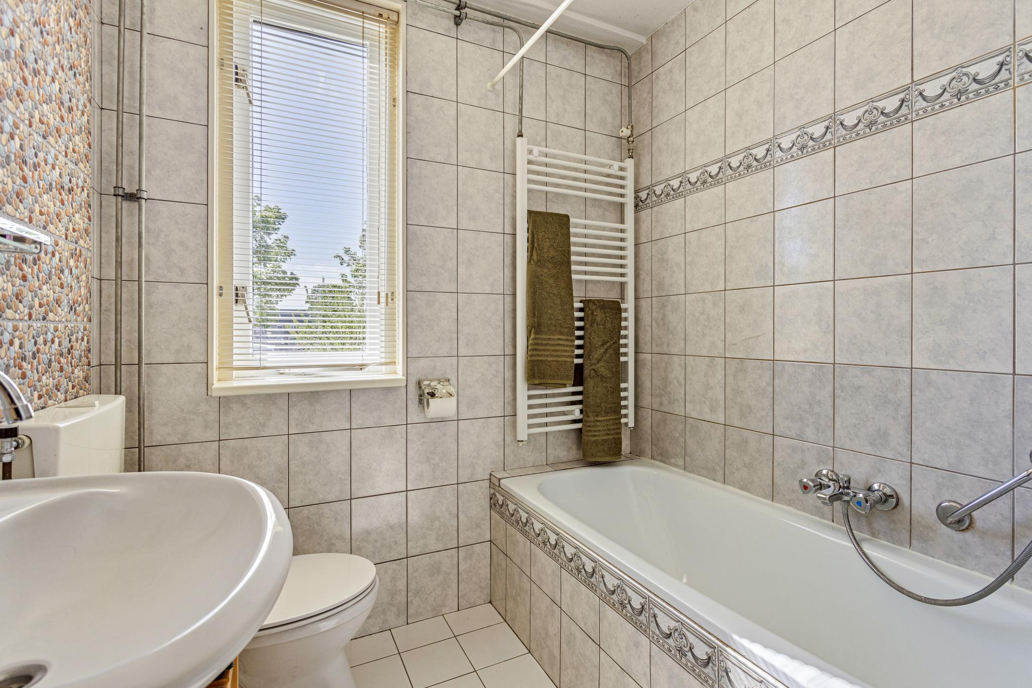 Betegelde badkamer voorzien van een ligbad, wastafel en een closet.