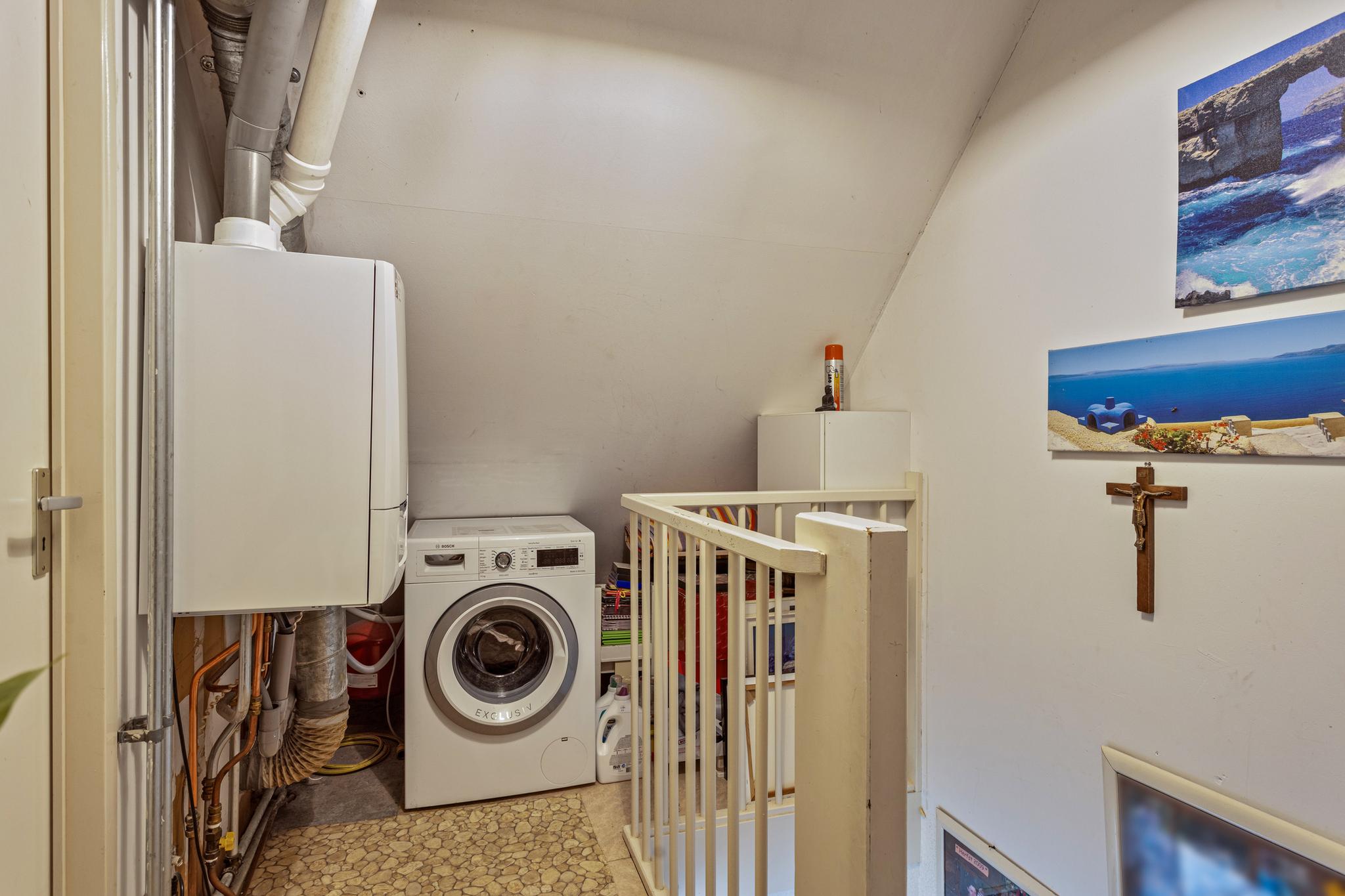Voorzolder met de aansluiting t.b.v. wasapparatuur en de opstelling van de HR combiketel van het merk Remeha uit het bouwjaar 2022.