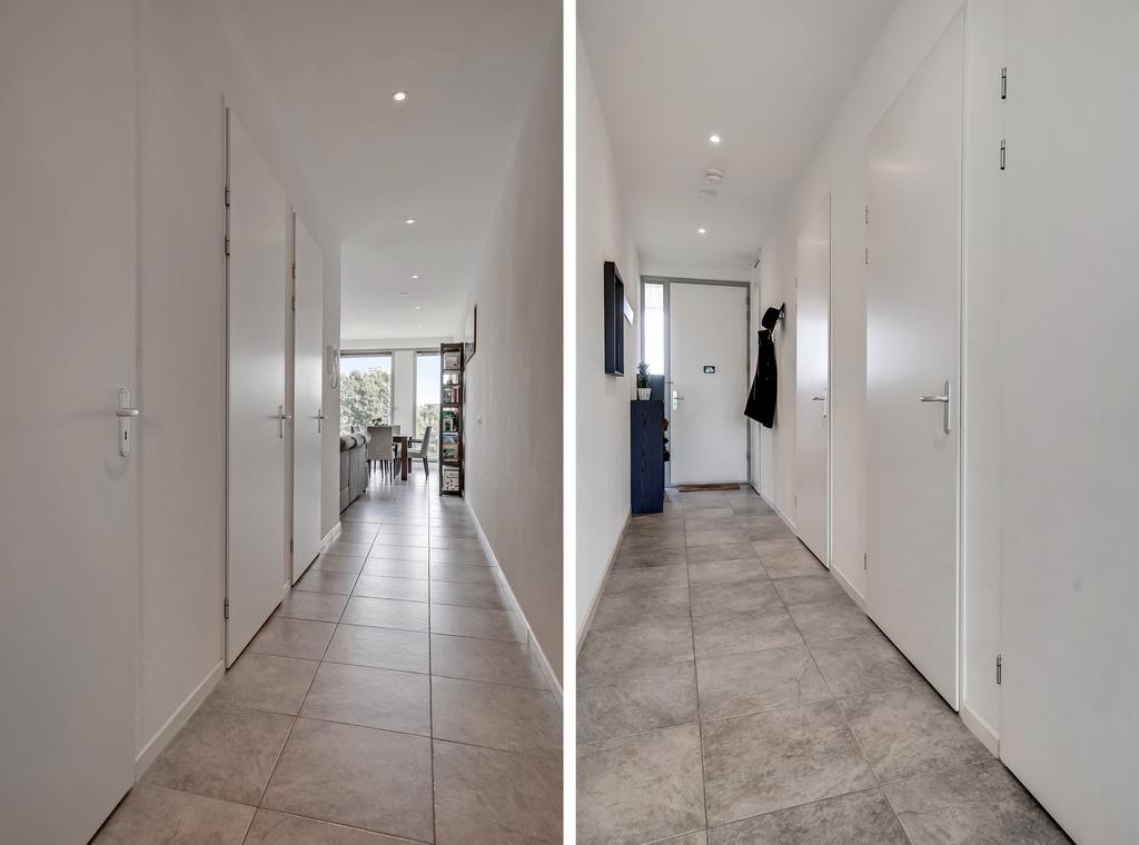 Hal met de videofoon installatie en afgewerkt met een tegelvloer, stucwerk wanden en een strak stucwerk plafond met inbouwverlichting.