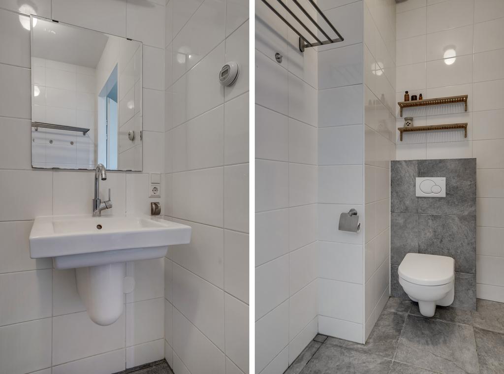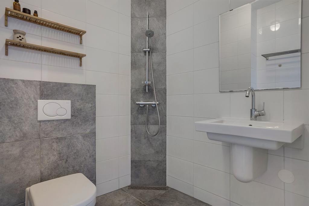 Modern betegelde badkamer voorzien van een open douche met thermostaatkraan, wastafel (Villeroy & Boch) en zwevend closet met muurspoeling (Villeroy & Boch).