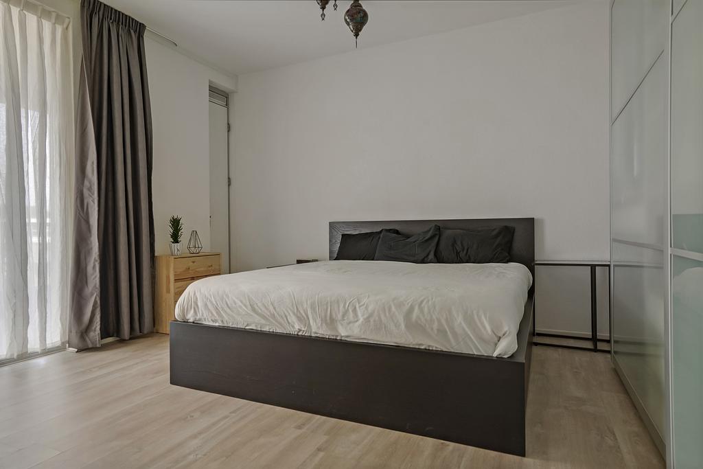 Ruime slaapkamer afgewerkt met een laminaatvloer, stucwerk wanden en een pleisterwerk plafond.