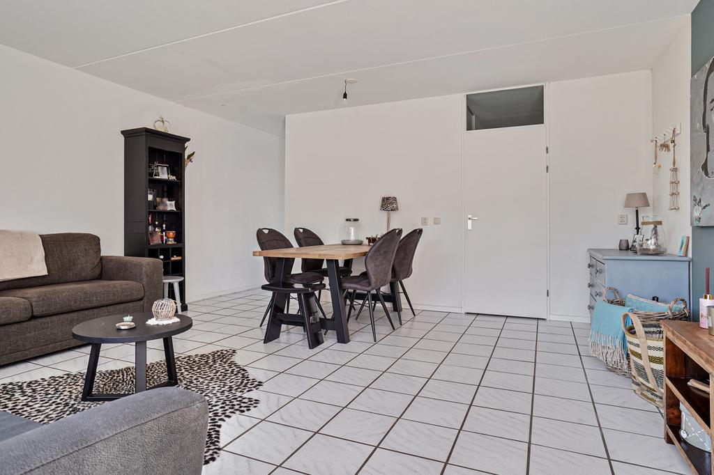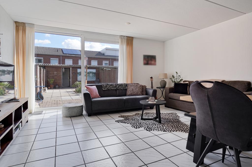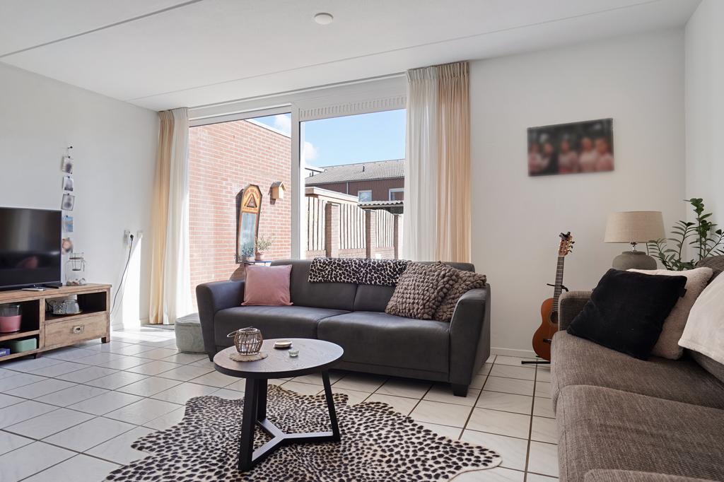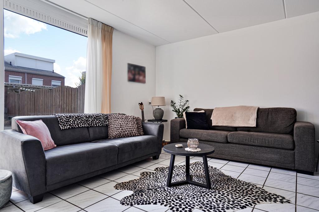 De gezellige living met uitkijk op de achtertuin is afgewerkt met een lichte tegelvloer, structuur wanden en een spuitwerk plafond.