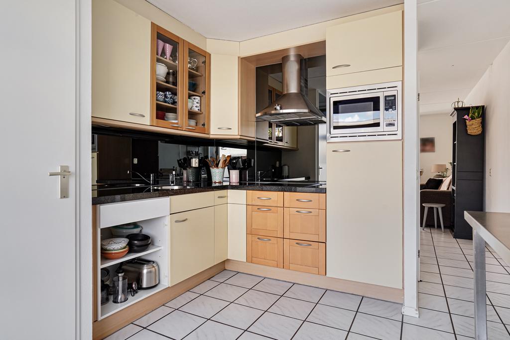 Praktische keukeninrichting in hoekopstelling voorzien van diverse laden en kasten, combi magnetron oven, koelkast, keramische kookplaat, afzuigkap, rvs spoelbak en een natuurstenen werkblad.