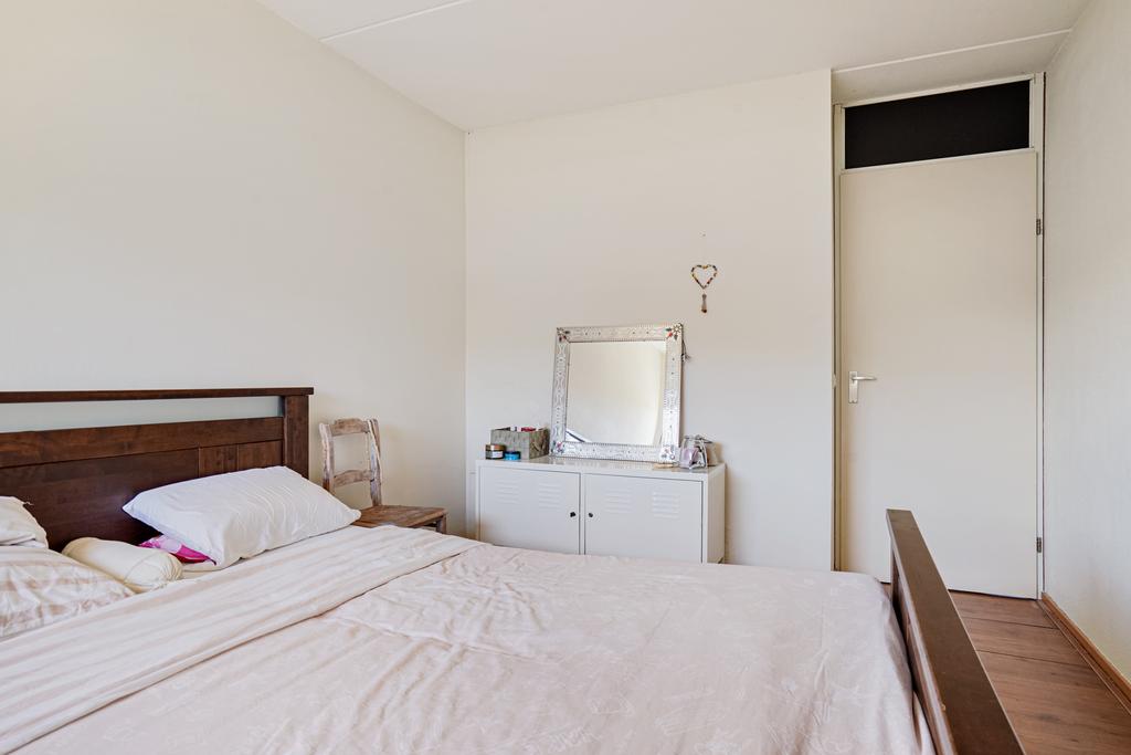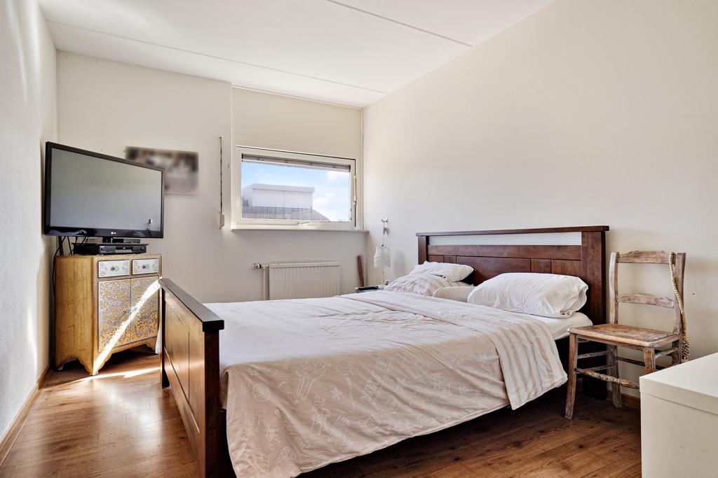 Slaapkamer 1 aan achterzijde afgewerkt met een laminaatvloer, gesausde wanden en een spuitwerk plafond.