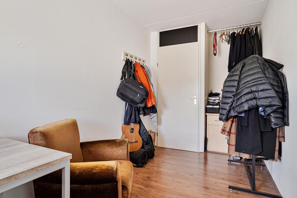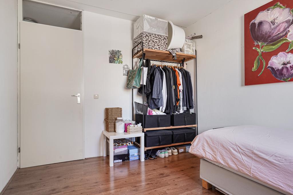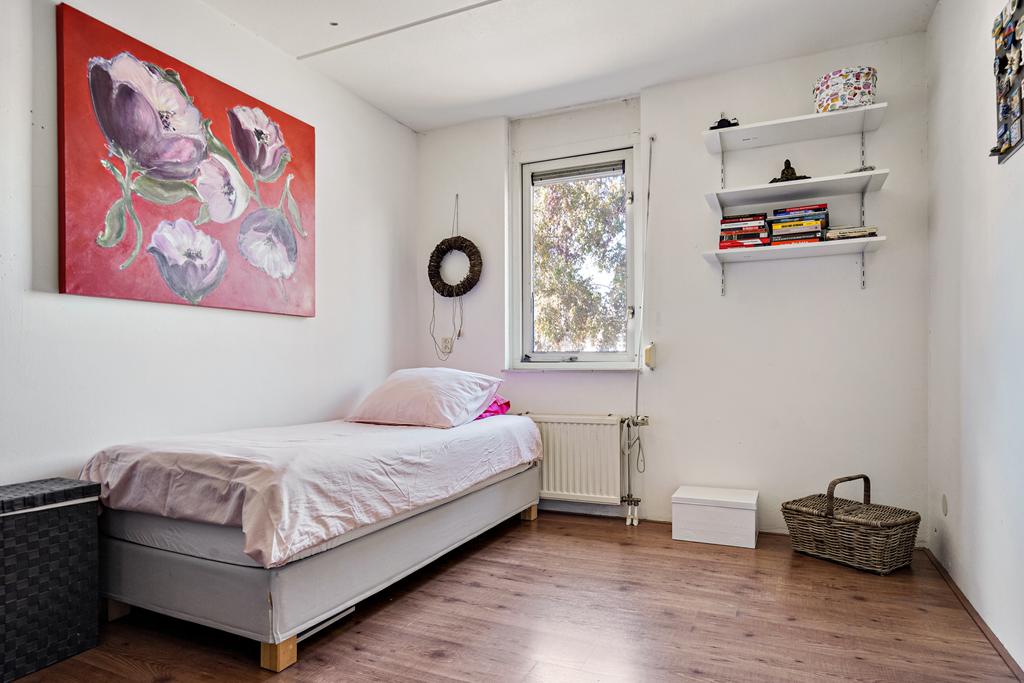 Slaapkamer 2 aan voorzijde afgewerkt met een laminaatvloer, wit gesausde wanden en een spuitwerk plafond.