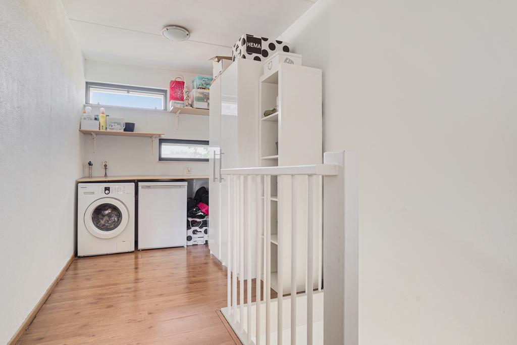 Overloop met de aansluiting t.b.v. wasapparatuur en afgewerkt met een laminaatvloer, structuur wanden en een spuitwerk plafond.