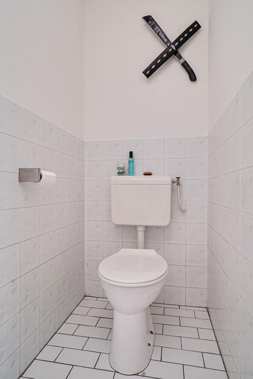 Deels betegelde toiletruimte met een fonteintje en closet.