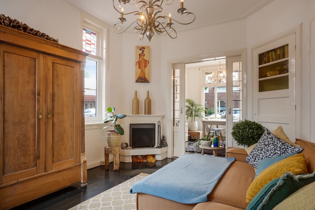 De sfeervolle woonkamer en suite met schuifdeuren, openslaande tuindeuren, muurkast en schouw is afgewerkt met een houten delen vloer, pleisterwerk wanden en een stucwerk plafond met ornamenten.
