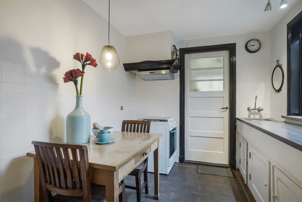 Afzonderlijke keuken afgewerkt met een tegelvloer en deels betegelde wanden.