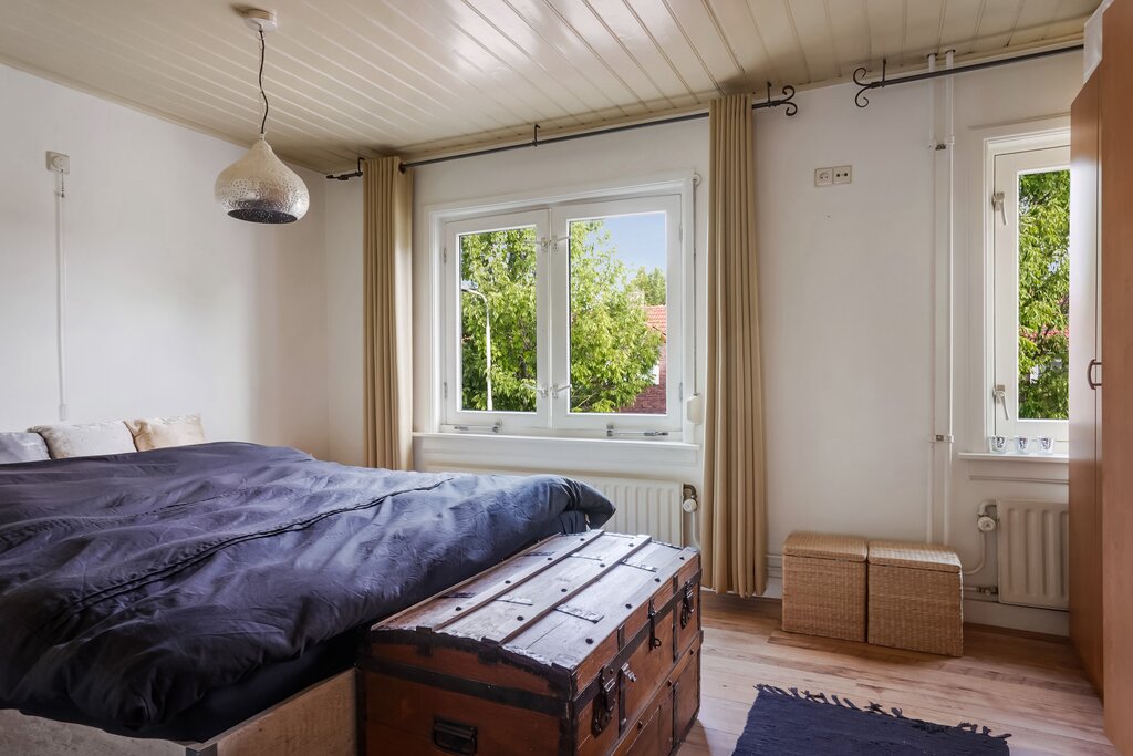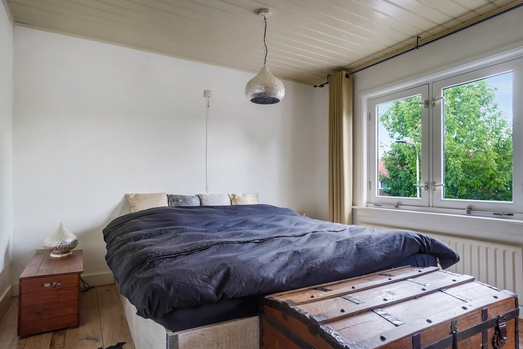 Slaapkamer 1 aan voorzijde is afgewerkt met een laminaatvloer, pleisterwerk wanden en een houten delen plafond.