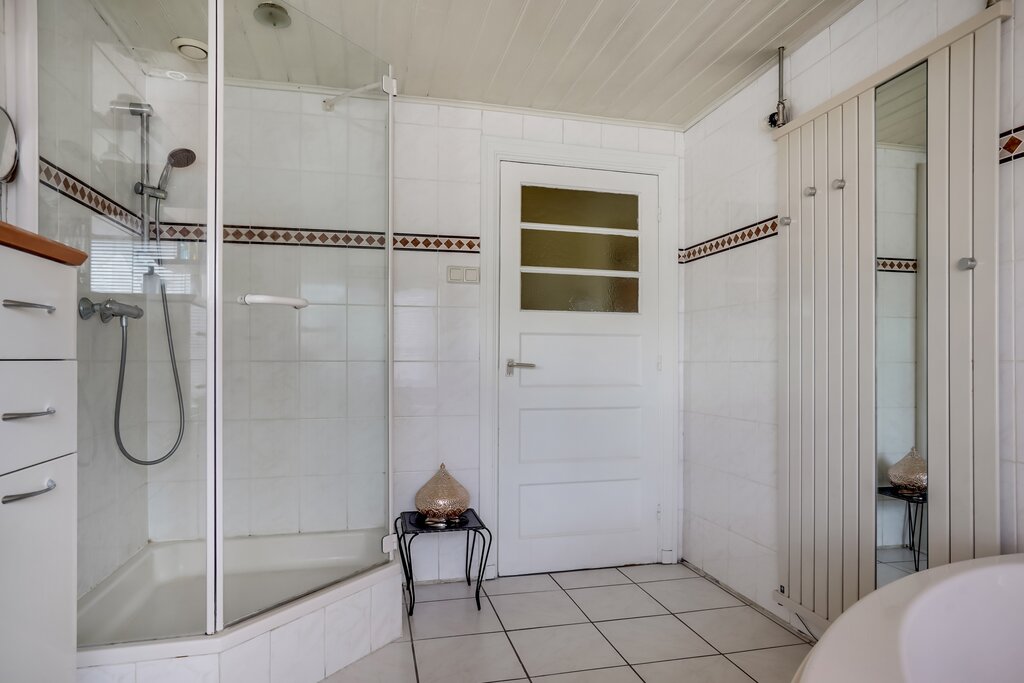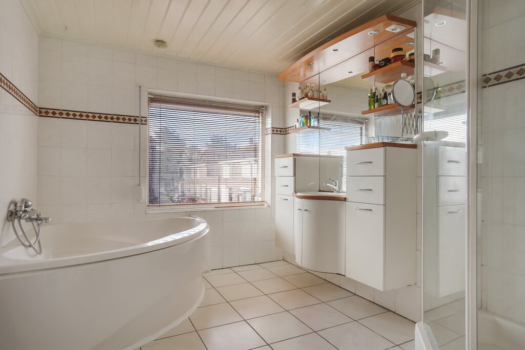 Royale betegelde badkamer voorzien van een kunststof hoekbad, separate douchecabine, designradiator en een badmeubel met wastafel.
