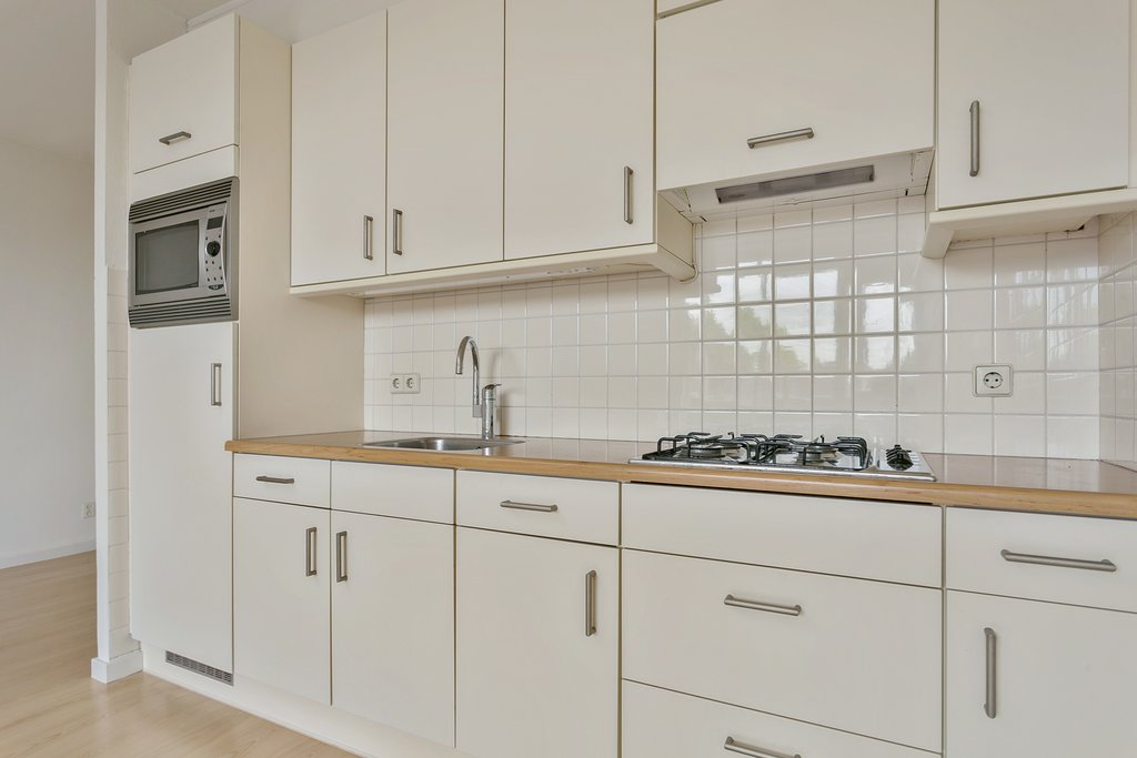 Open keuken met een eigentijdse keukeninrichting voorzien van diverse laden en kasten, koelkast, combi magnetron, koelkast, 4-pits gaskookplaat en afzuigkap.