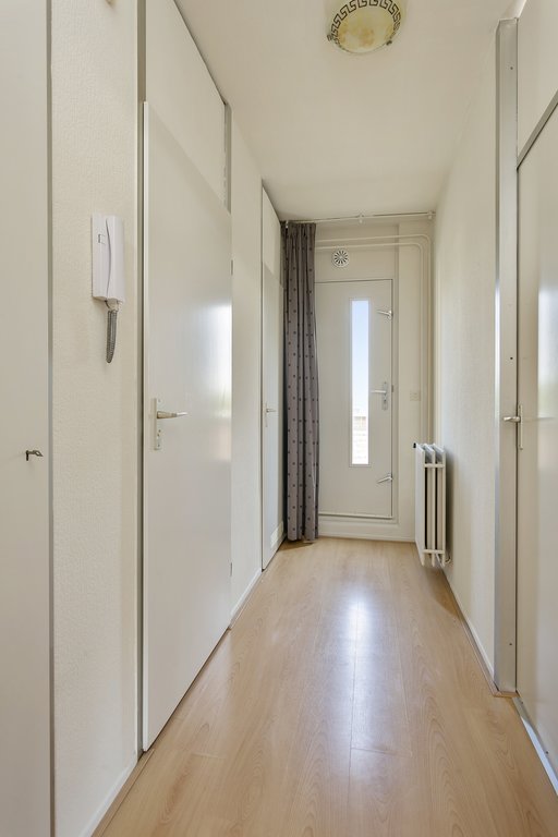 Hal met de intercominstallatie en afgewerkt met een laminaatvloer, behangen wanden en een spuitwerk plafond.