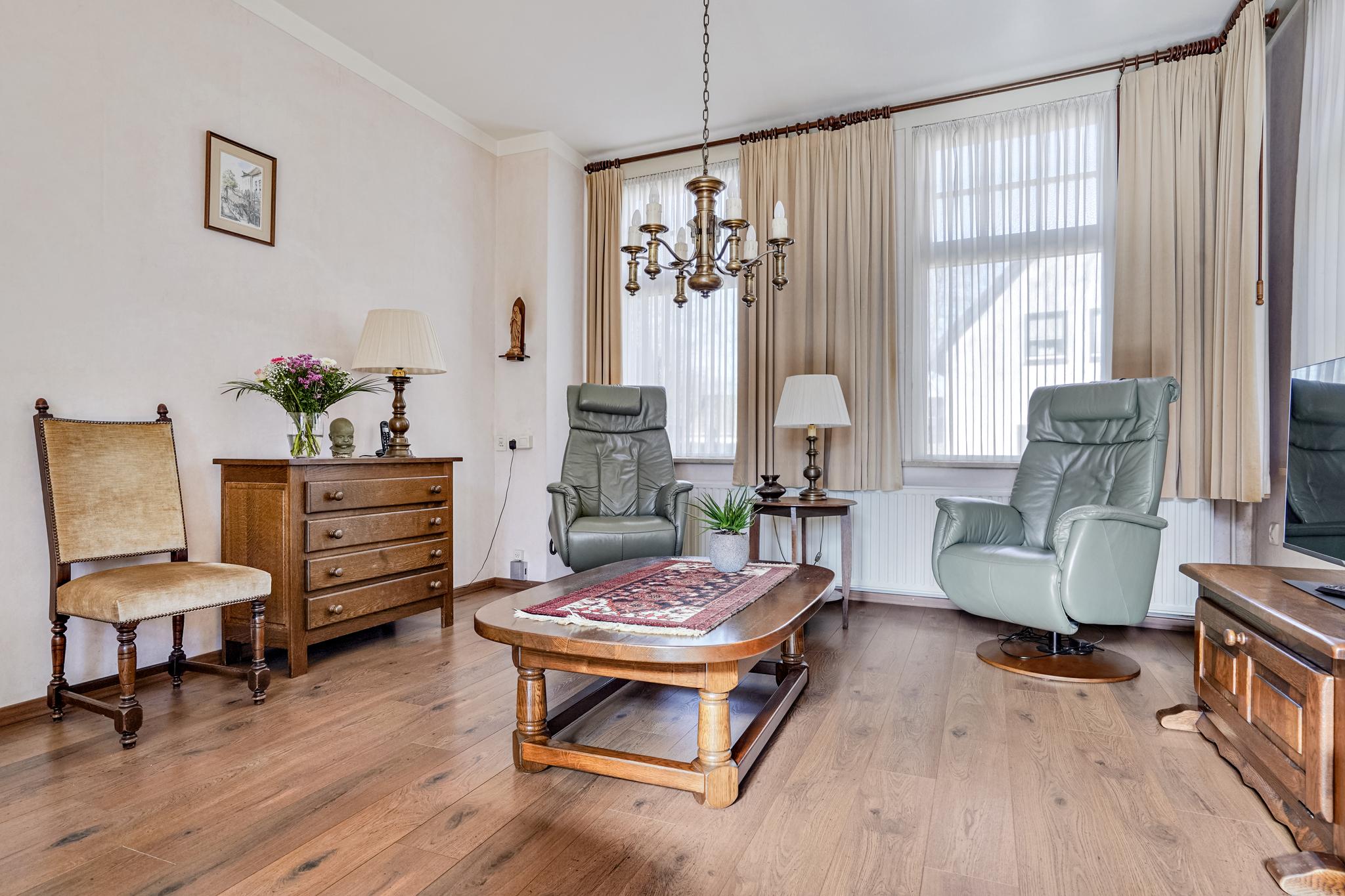 Sfeervolle living met openslaande tuindeuren en de kamer is afgewerkt met een laminaatvloer, behangen en een pleisterwerk plafond.