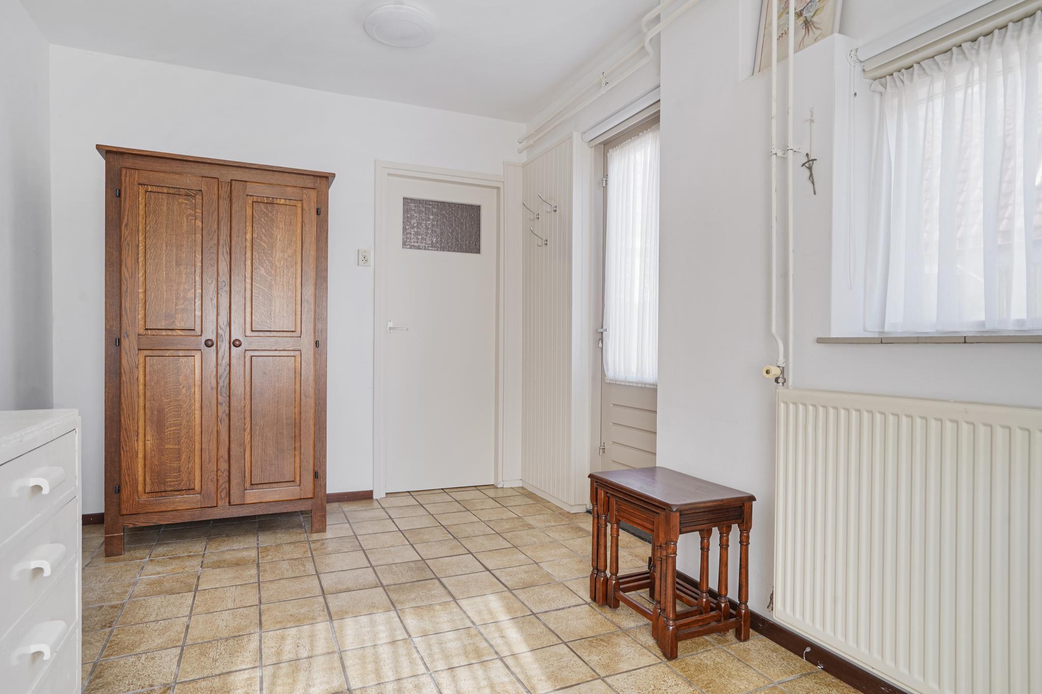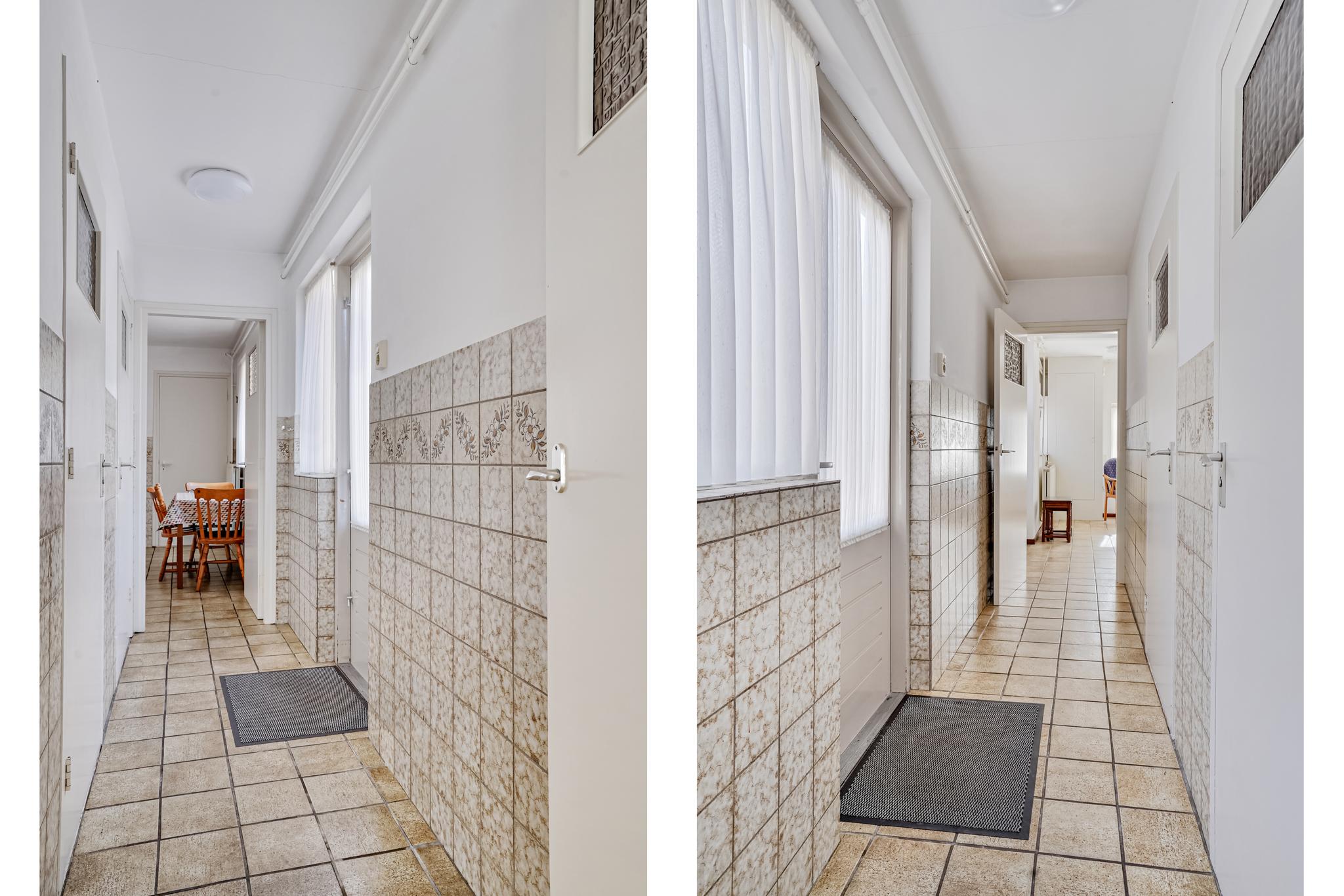Deels betegeld achterportaal met toegang tot de betegelde toiletruimte met een zwevend closet en fonteintje.