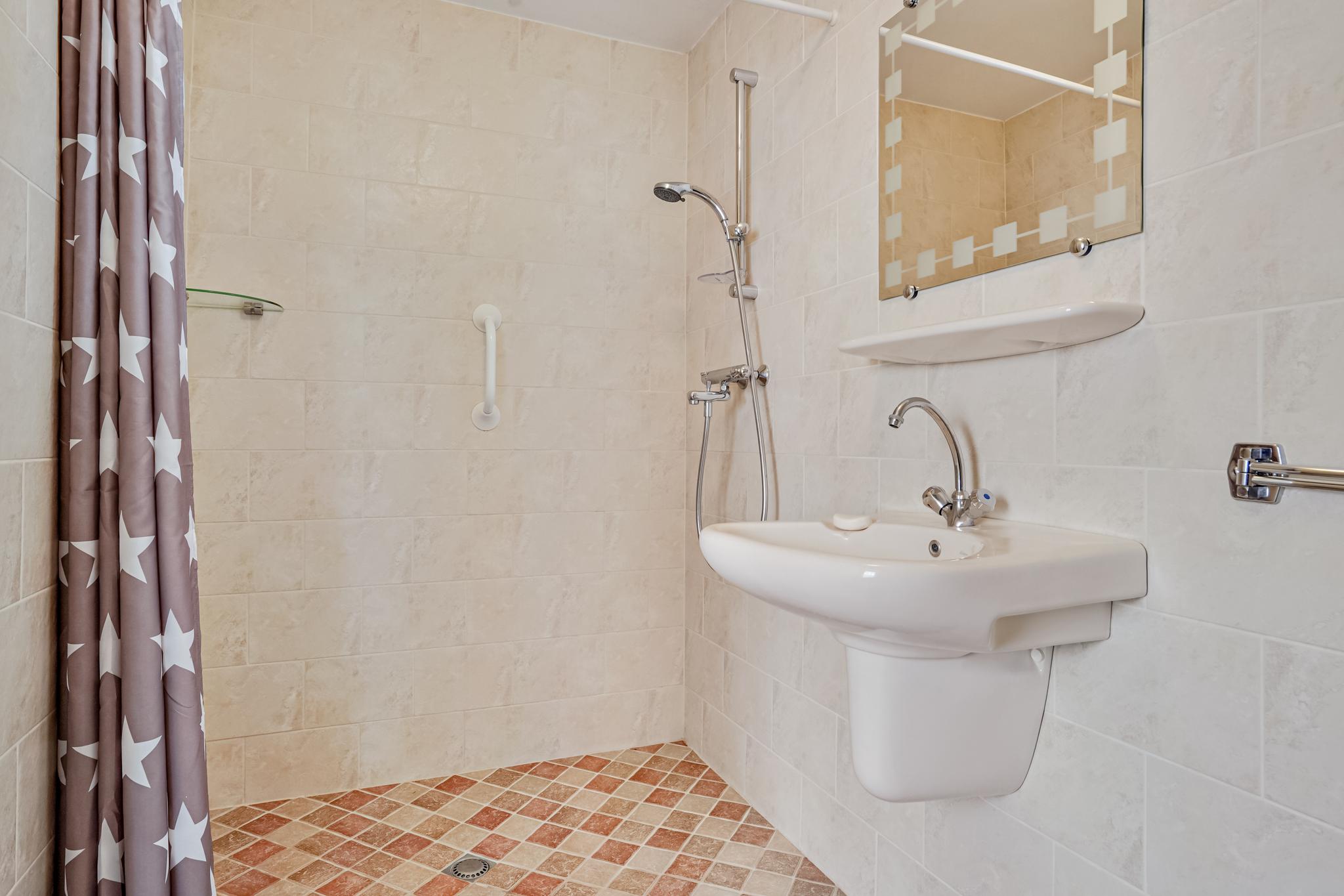 De betegelde badkamer is voorzien van een open douche met thermostaat en een wastafel.