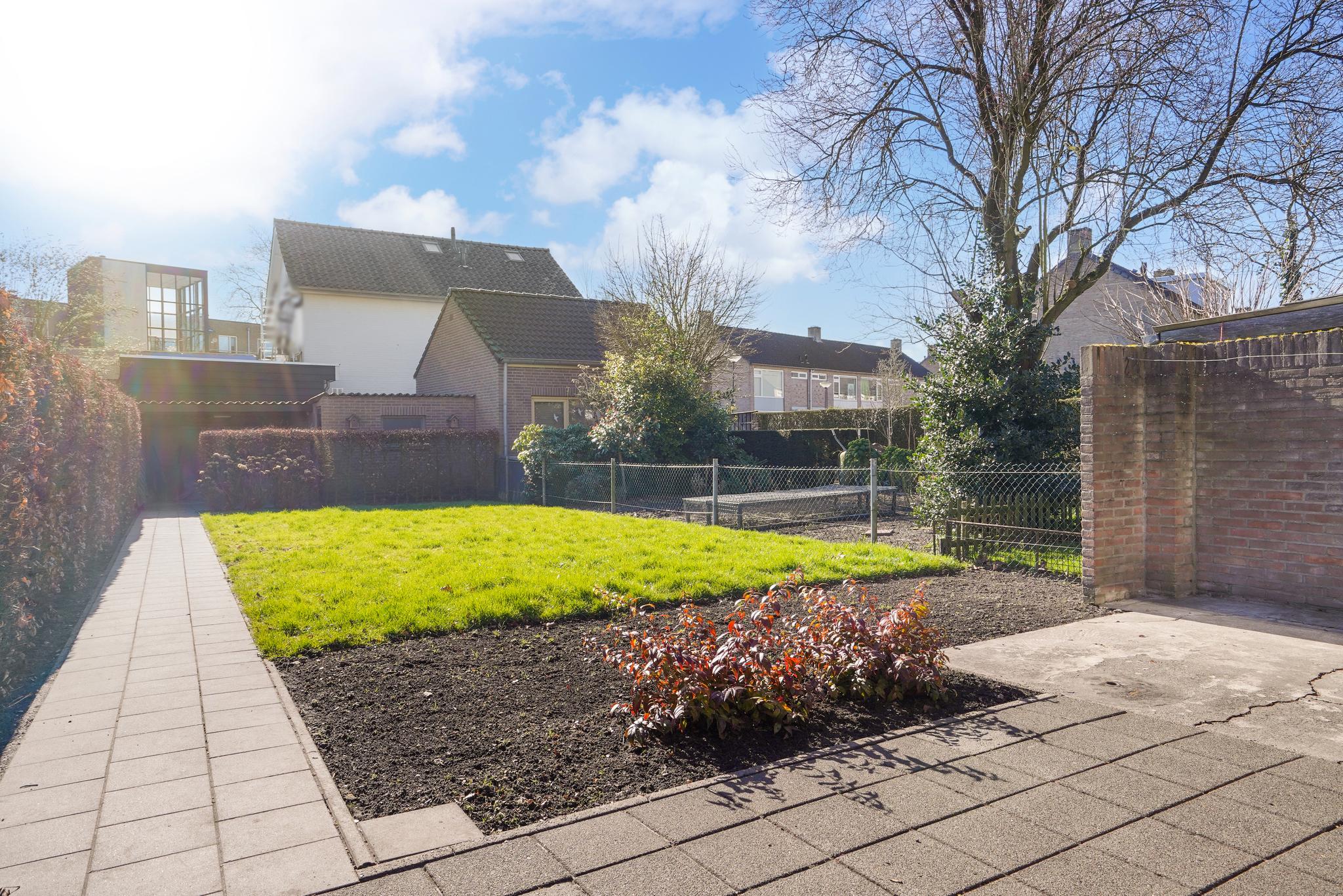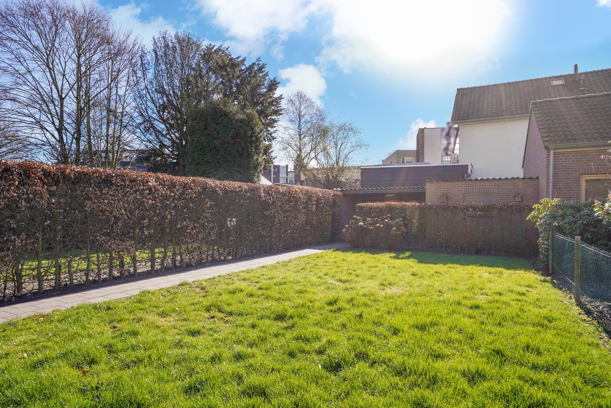 De achtertuin met afsluitbare achterom heeft een diepte van circa 35 meter en is keurig aangelegd met terrastegels, gazon en diverse beplanting.