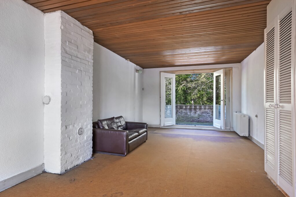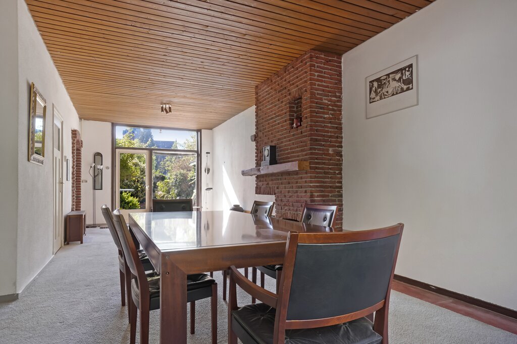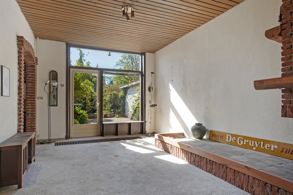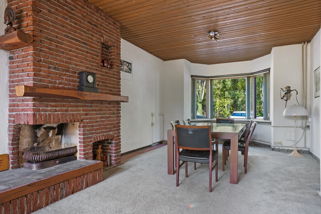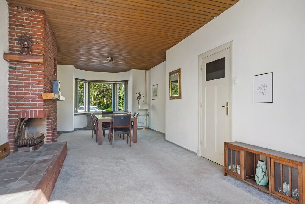 Sfeervolle royale Living met een erker aan voorzijde, openslaande tuindeur en schoonmetselwerk schouw.