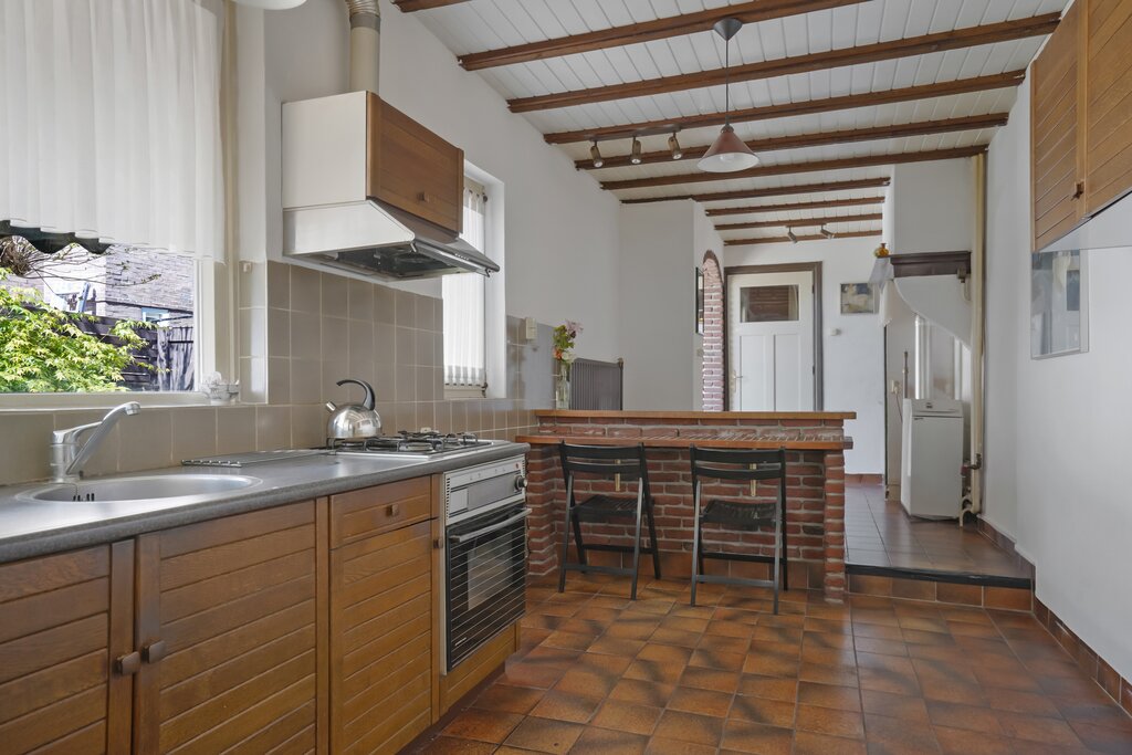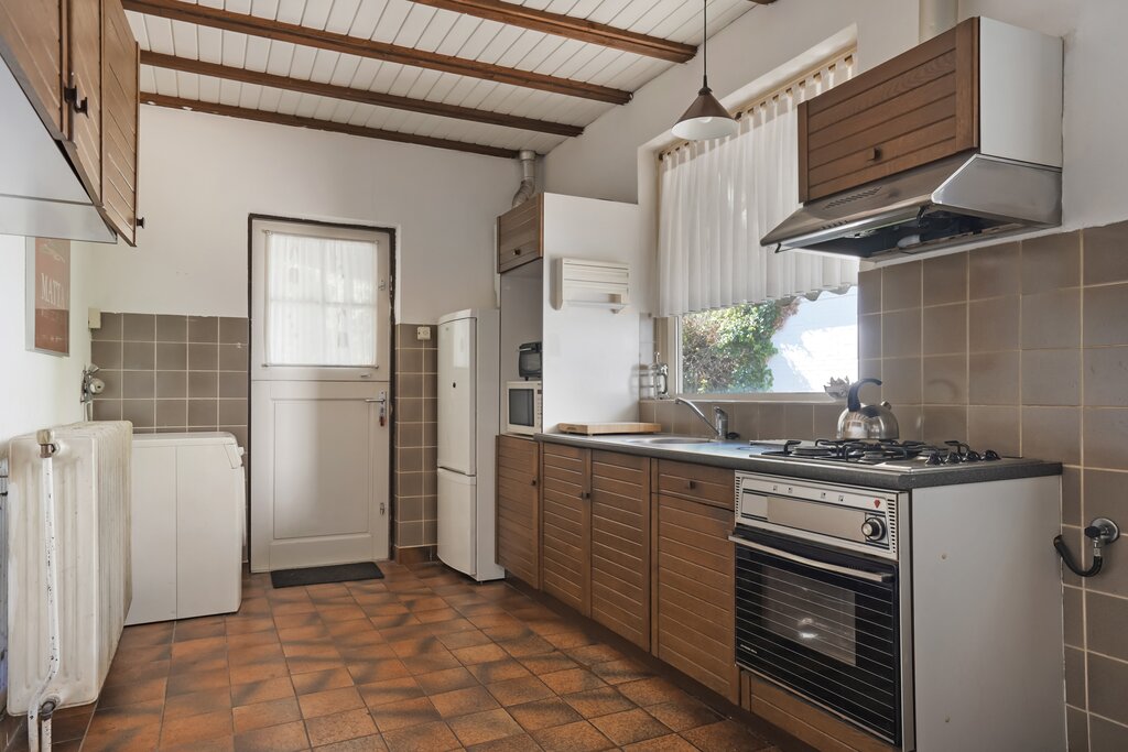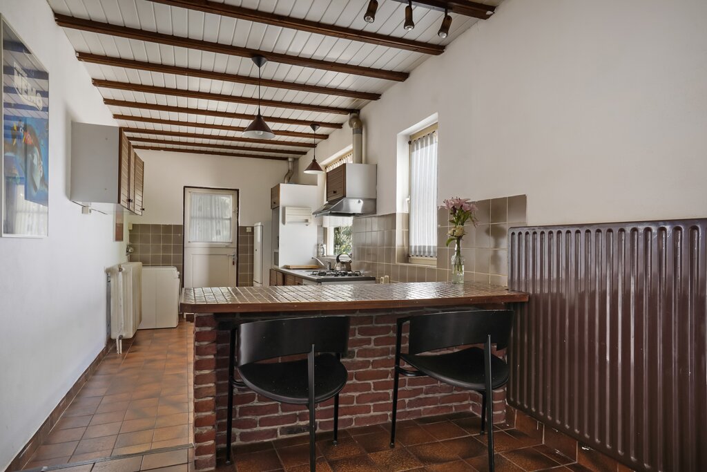 Gezellige woonkeuken afgewerkt met een tegelvloer, stucwerk deels tegelwerk wanden.