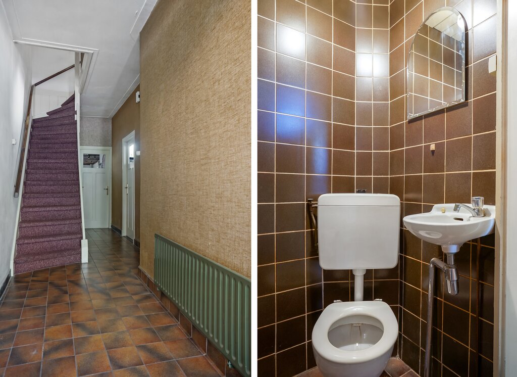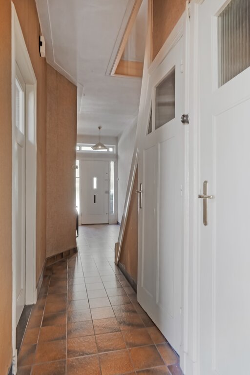 Gang afgewerkt met een tegelvloer, behangen deels stucwerk wanden en een pleisterwerk plafond.