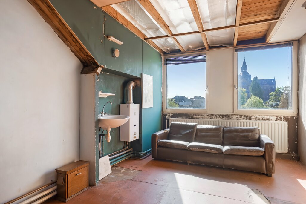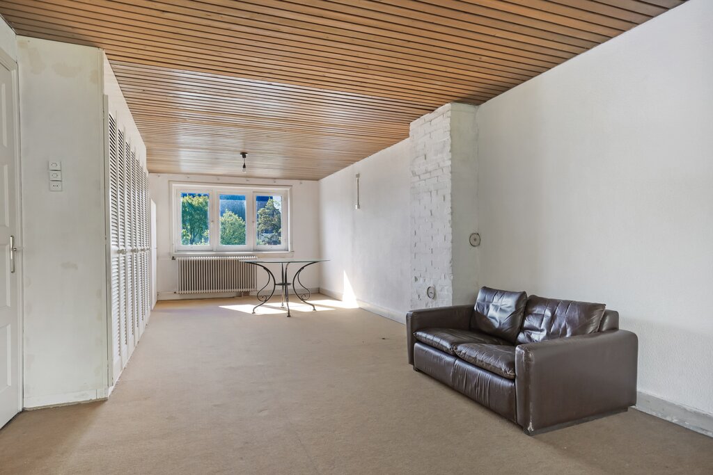 De woonkamer is afgewerkt spuitwerk wanden en een houten delen plafond.