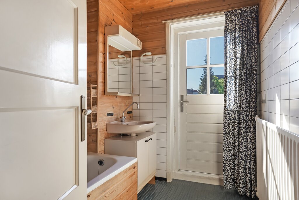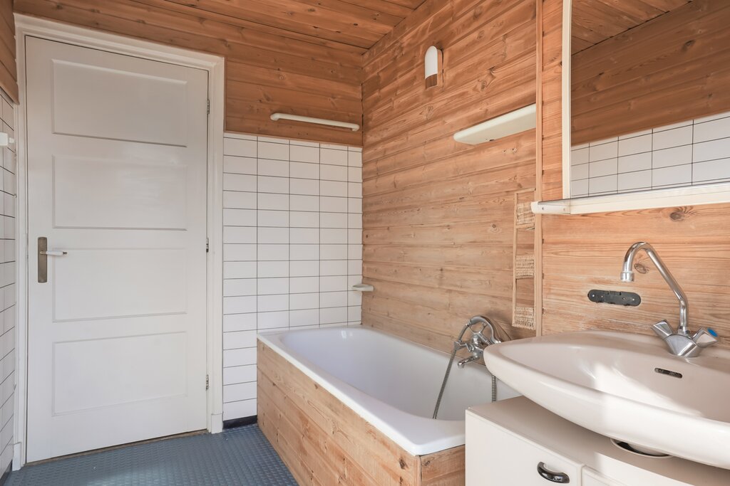 Deels betegelde badkamer met loopdeur naar klein dakterras. De badkamer is voorzien van een ligbad en wastafel.