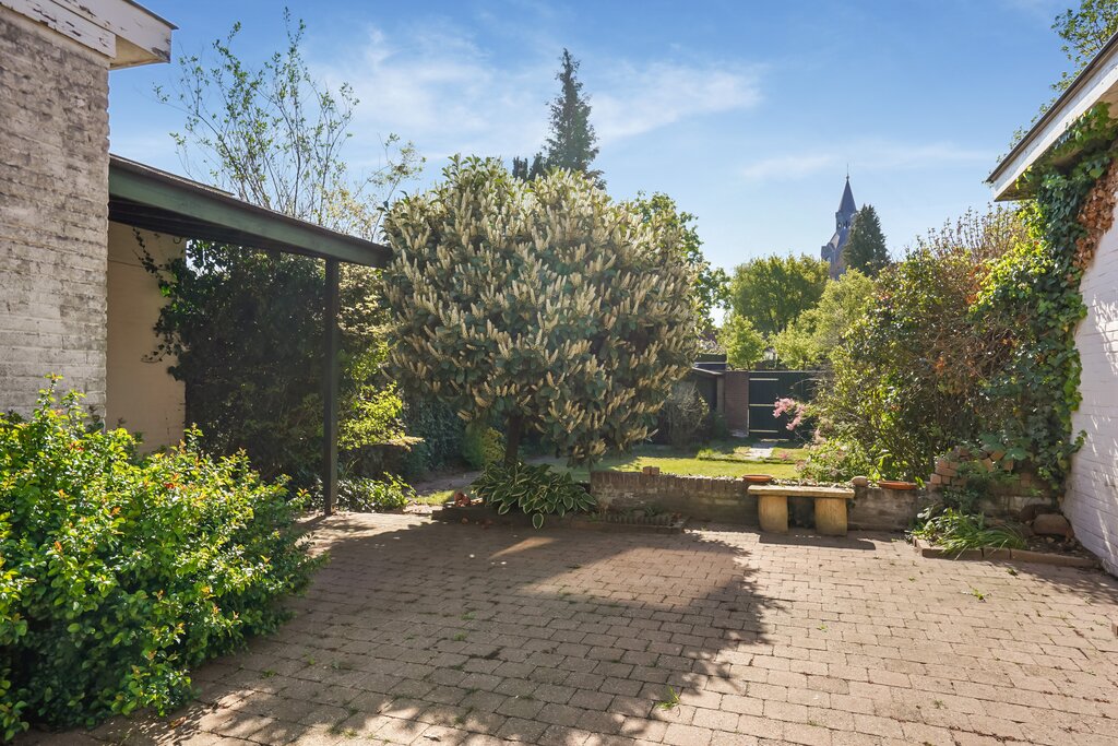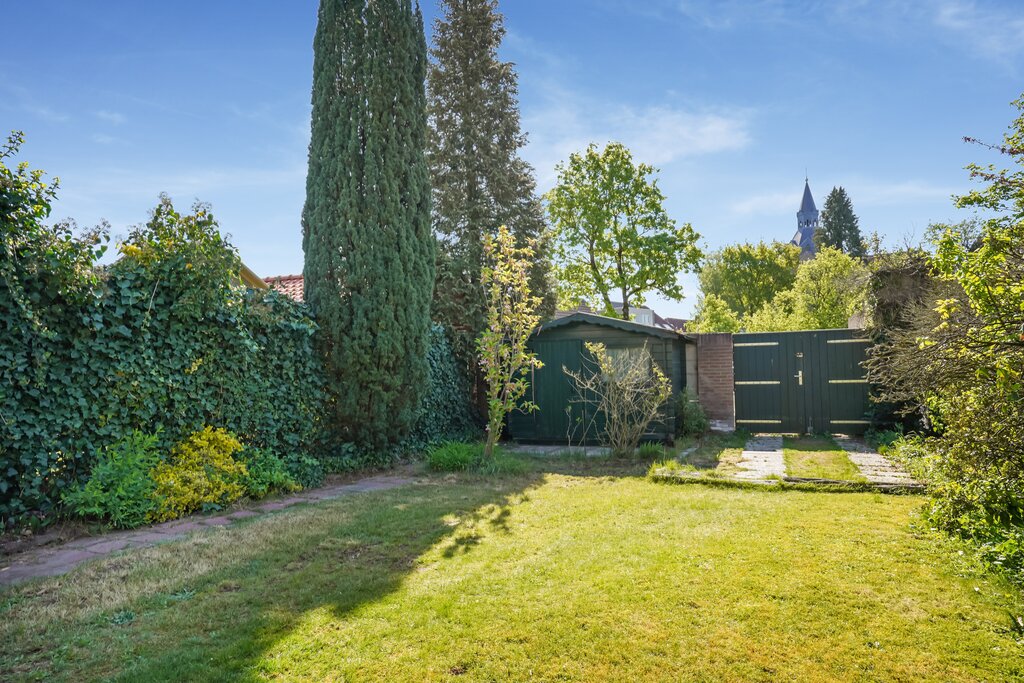 Achtertuin van circa 23 meter diep, houten berging, terrasoverkapping en aangelegd met sierbestrating, gazon en diverse beplantingen.