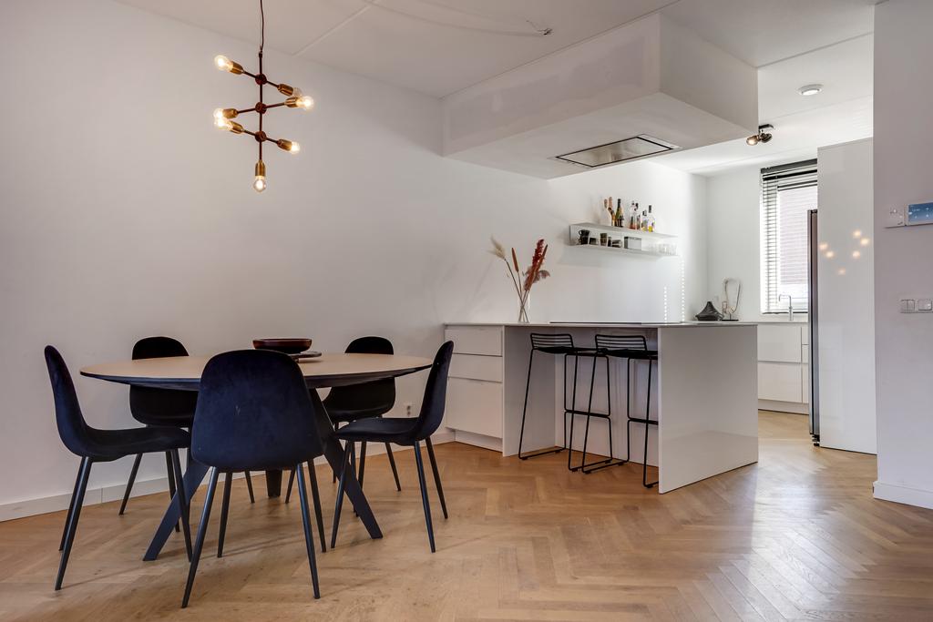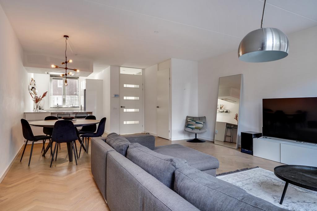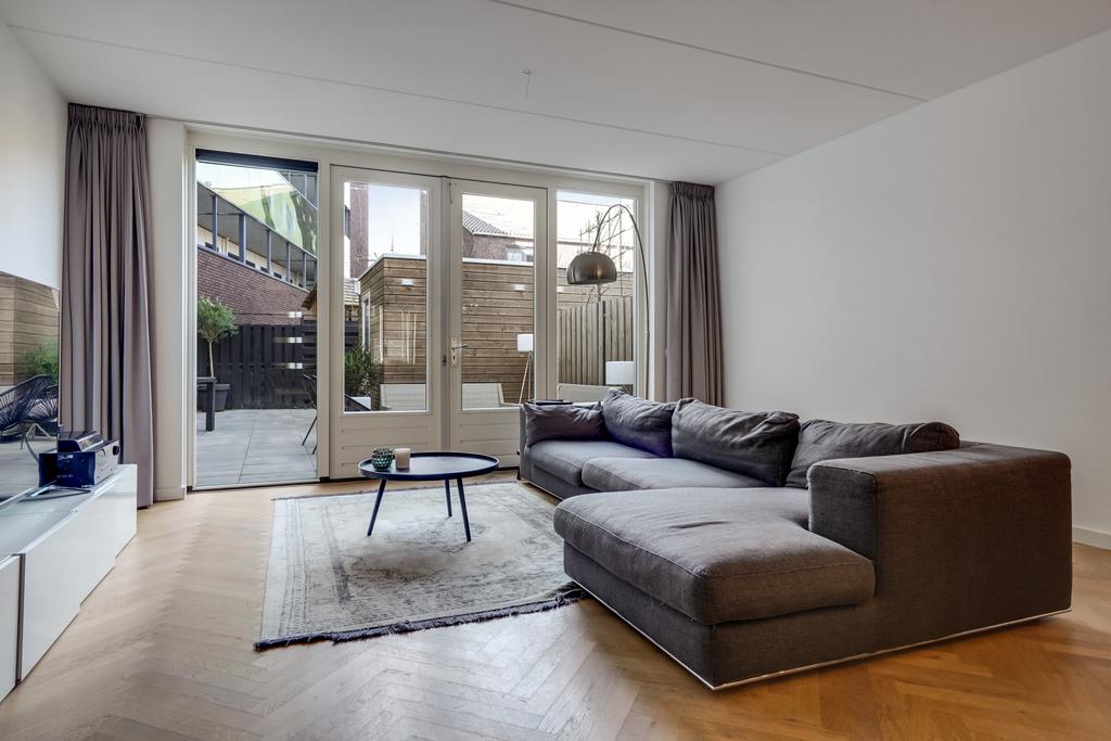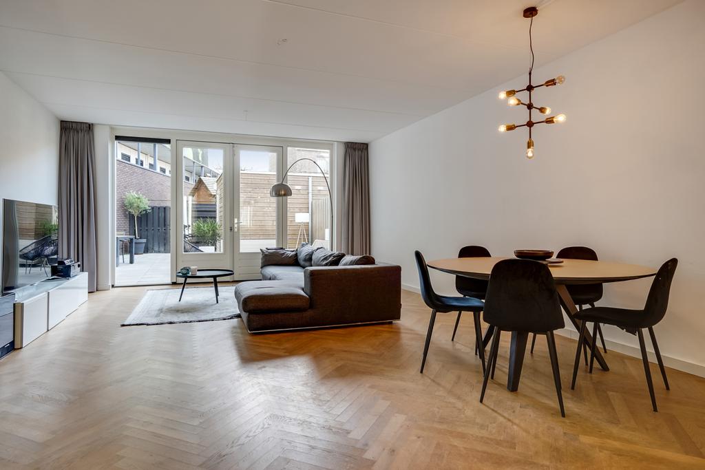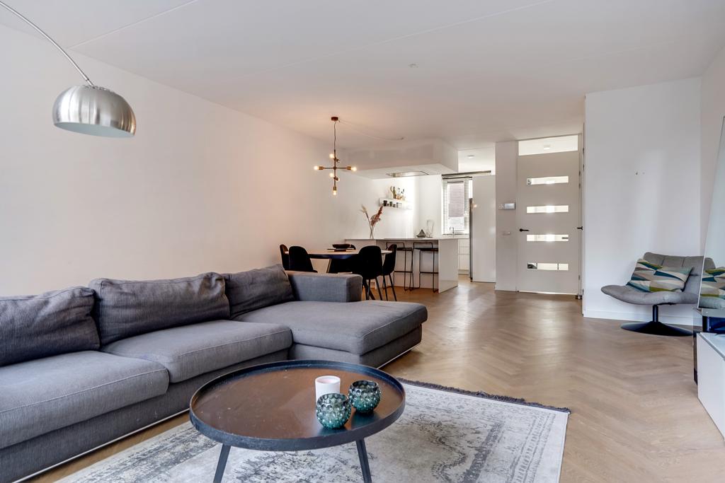 Ruime en sfeervolle uitgebouwde living met openslaande tuindeuren en afgewerkt met een parketvloer in visgraat motief gelegd en voorzien van vloerverwarming welke is doorgelegd over de gehele begane grond, pleisterwerk wanden en een spuitwerk plafond.