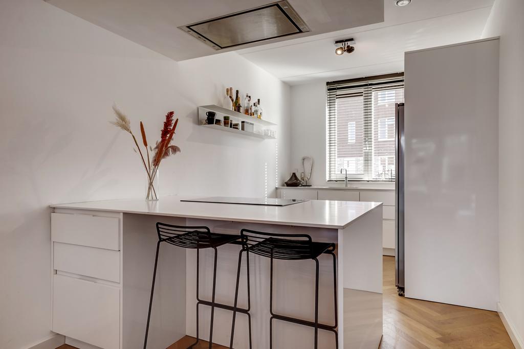 Open keuken met een luxe en complete Siematic keukeninrichting met kookeiland, eetbar, diverse laden en kastjes, rvs spoelbak, Quooker, Siemens vaatwasmachine, Siemens stoom combi magnetron, Siemens inductie kookplaat, afzuigkap en een Samsung Amerikaanse koelkast met dubbele deur.