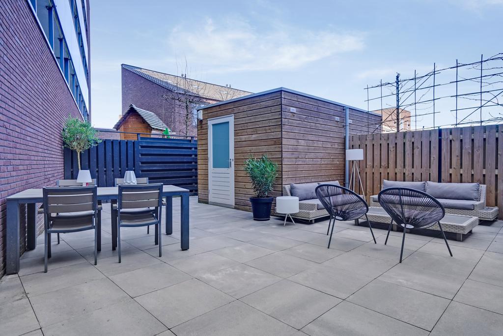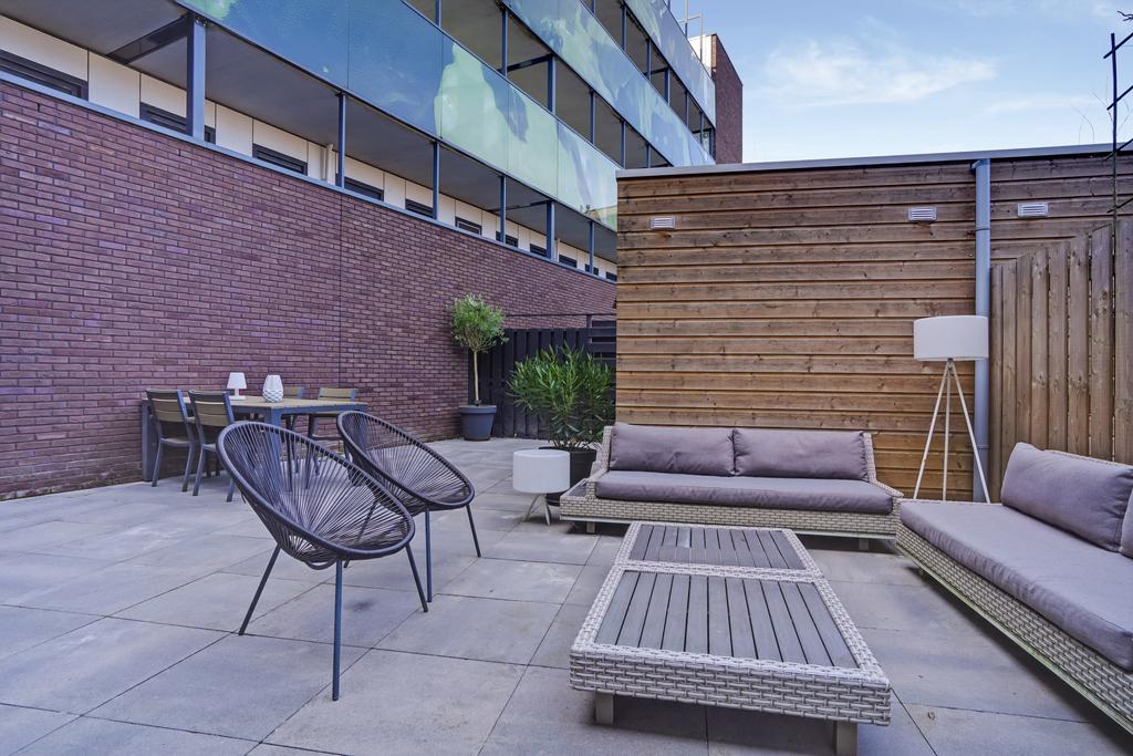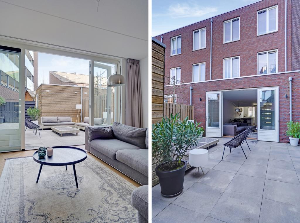 Achtertuin aangelegd met terrastegels buiten delen erfafscheiding achterom buitenverlichting.