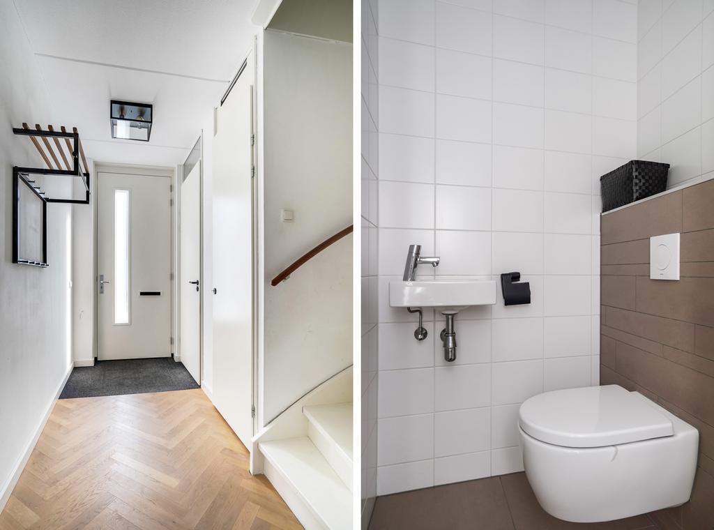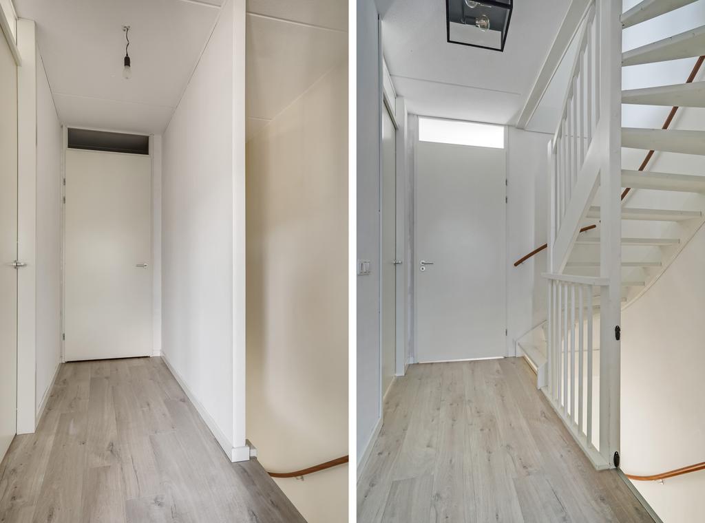 Hal afgewerkt met een parketvloer, pleisterwerk wanden en een spuitwerk plafond.