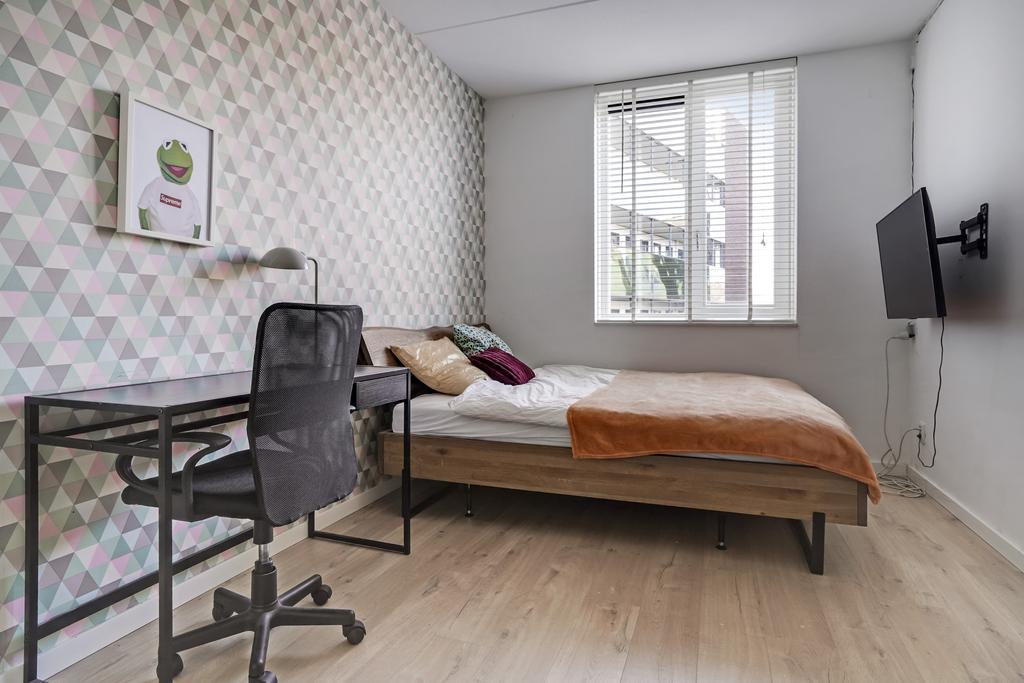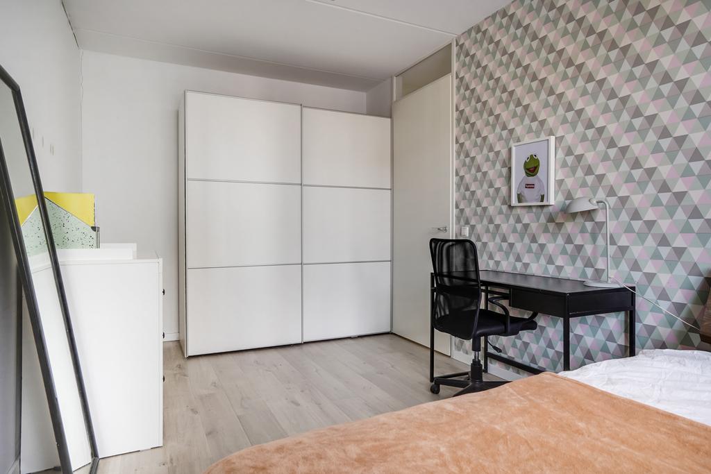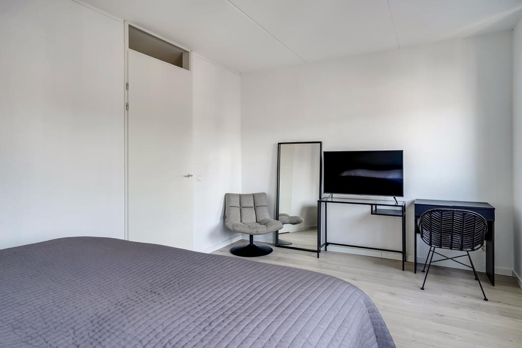 Slaapkamer 1 aan achterzijde is afgewerkt met een laminaatvloer, behangen deels pleisterwerk wanden en een spuitwerk plafond.