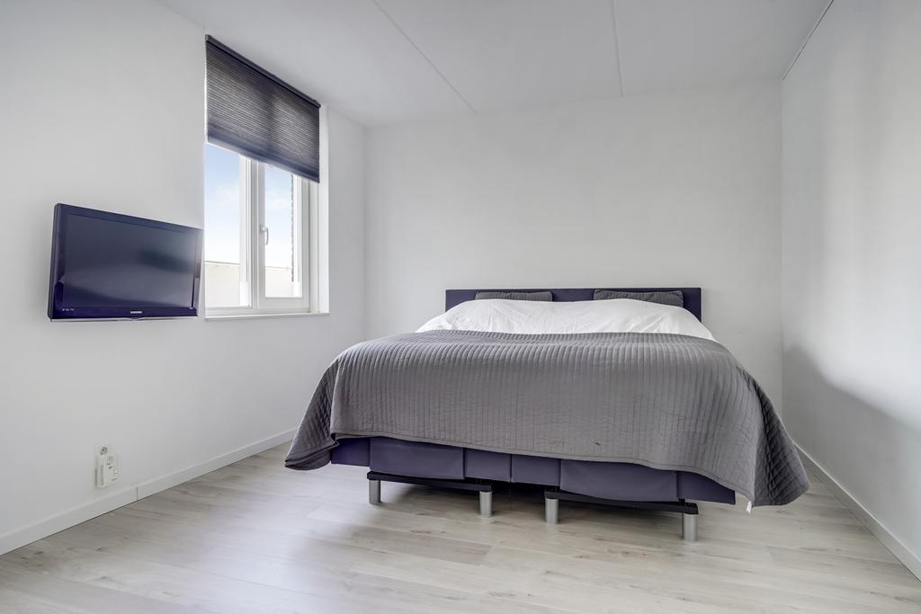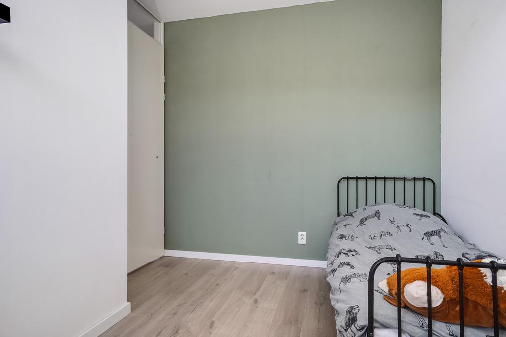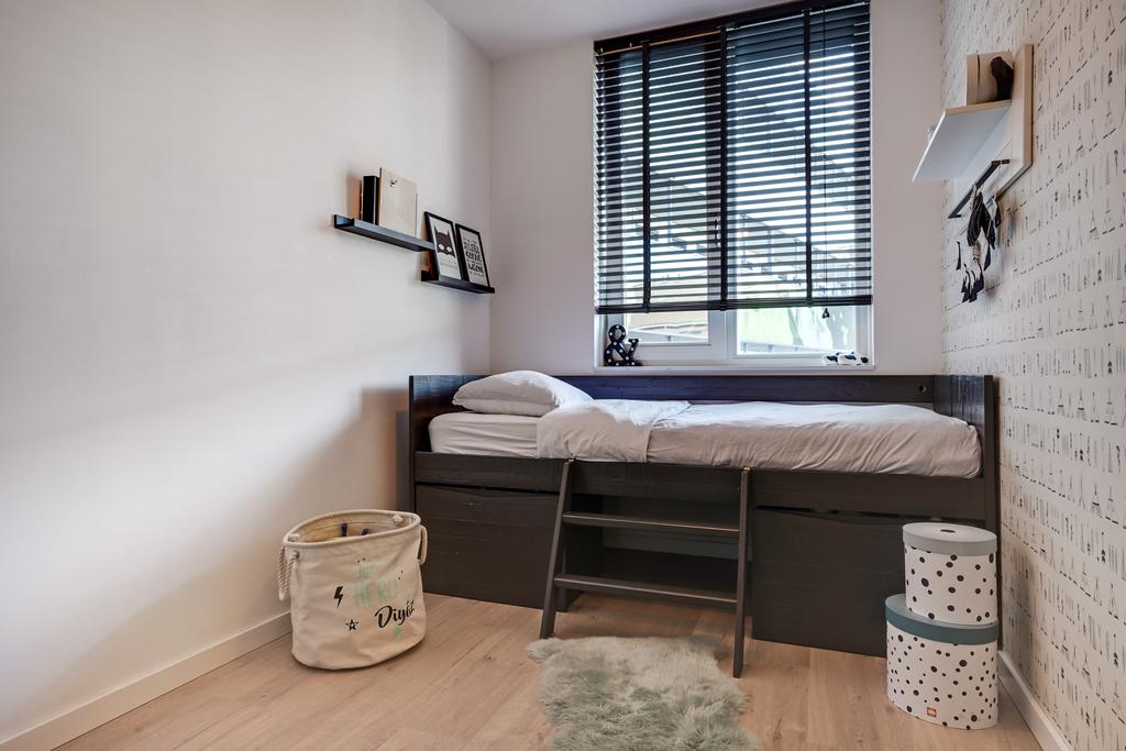 Slaapkamer 4 aan voorzijde afgewerkt met een laminaatvloer, pleisterwerk wanden en een spuitwerk plafond.