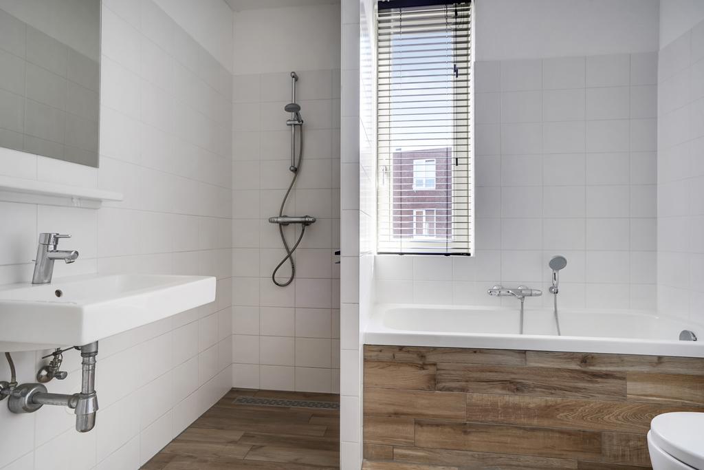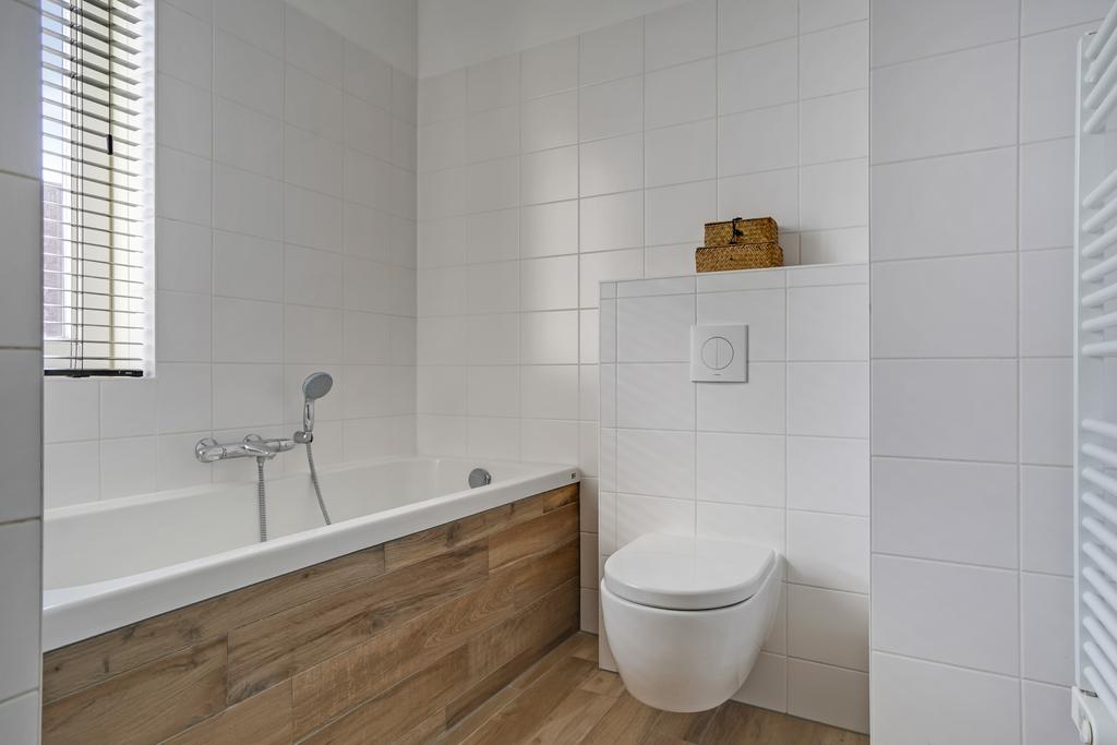 Eigentijdse betegelde badkamer voorzien van een ligbad, wastafel, zwevend closet en inloopdouche met thermostaatkraan.