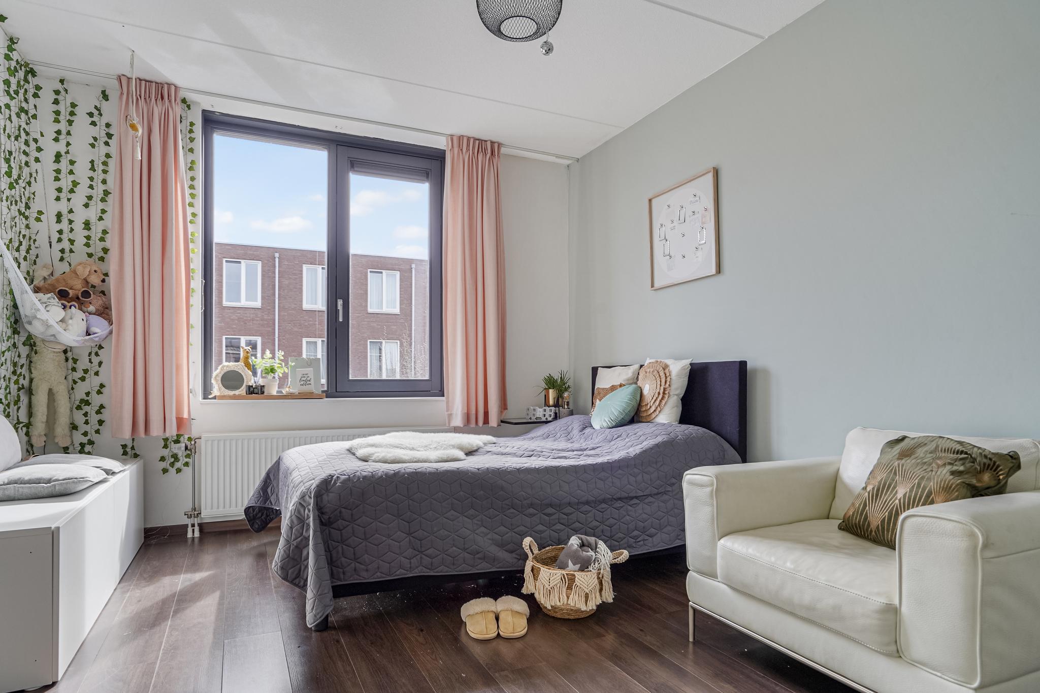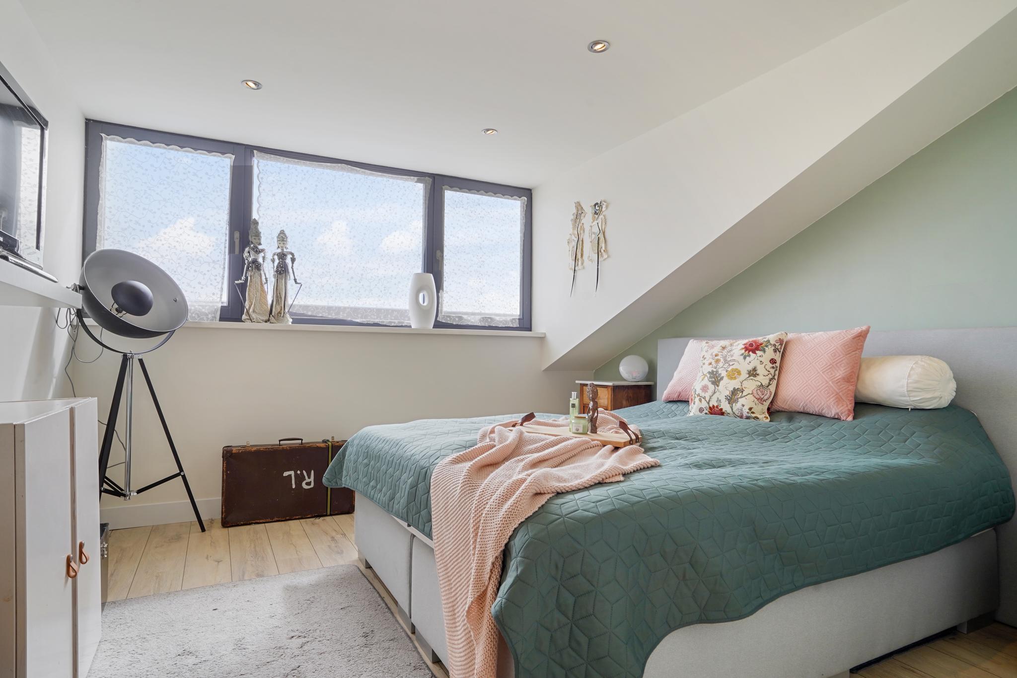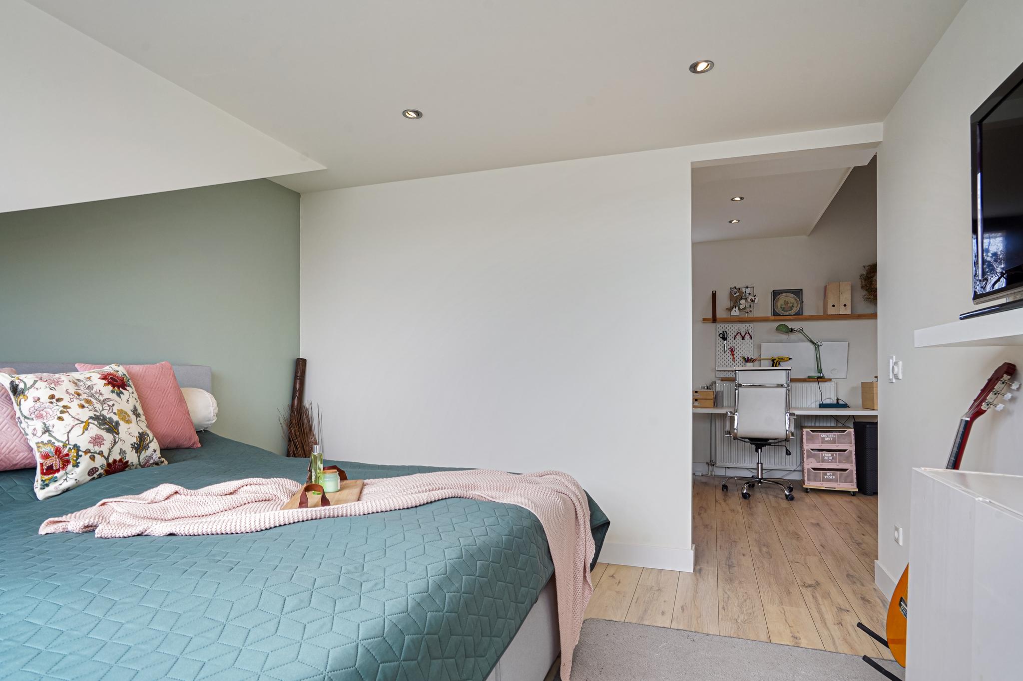 Slaapkamer 4 met een dakkapel aan achterzijde en afgewerkt met een laminaatvloer, stucwerk wanden en een stucwerk plafond met inbouwverlichting.