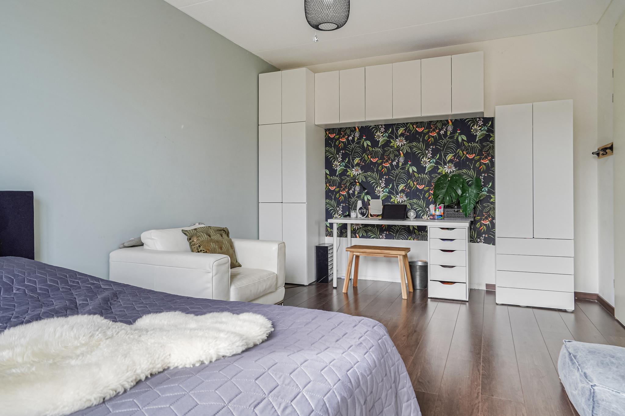 Slaapkamer 1 aan achterzijde is afgewerkt met een laminaatvloer, stucwerk wanden en een spuitwerk plafond.
