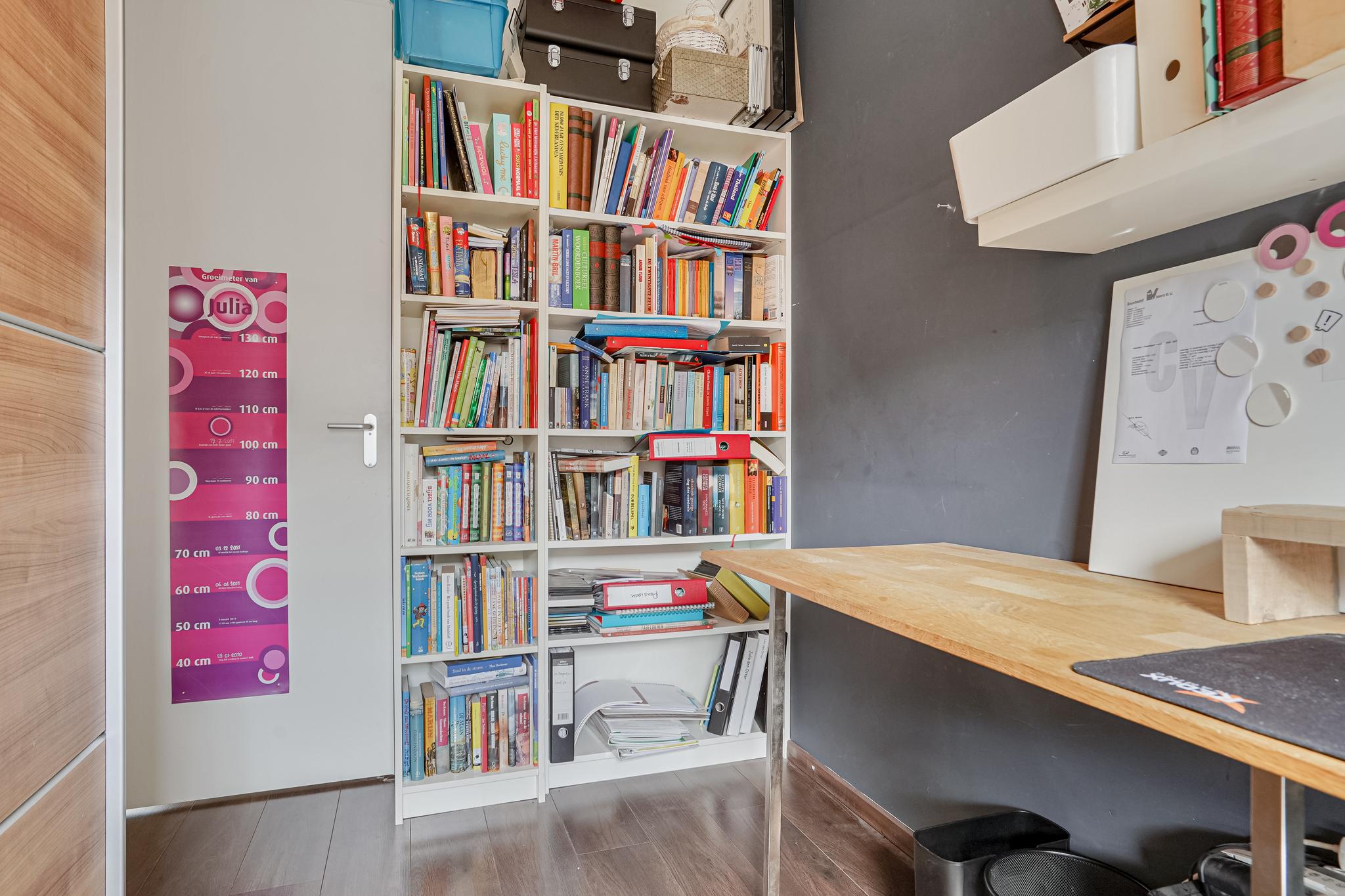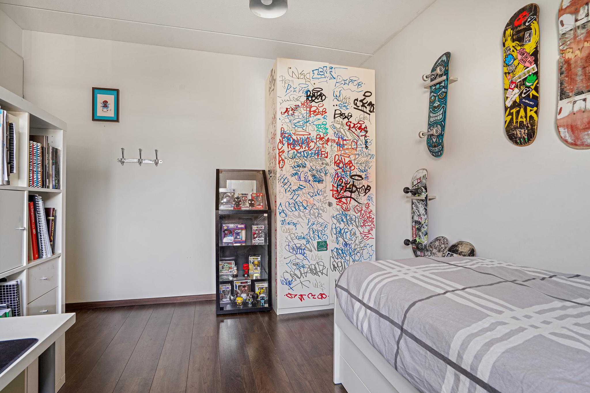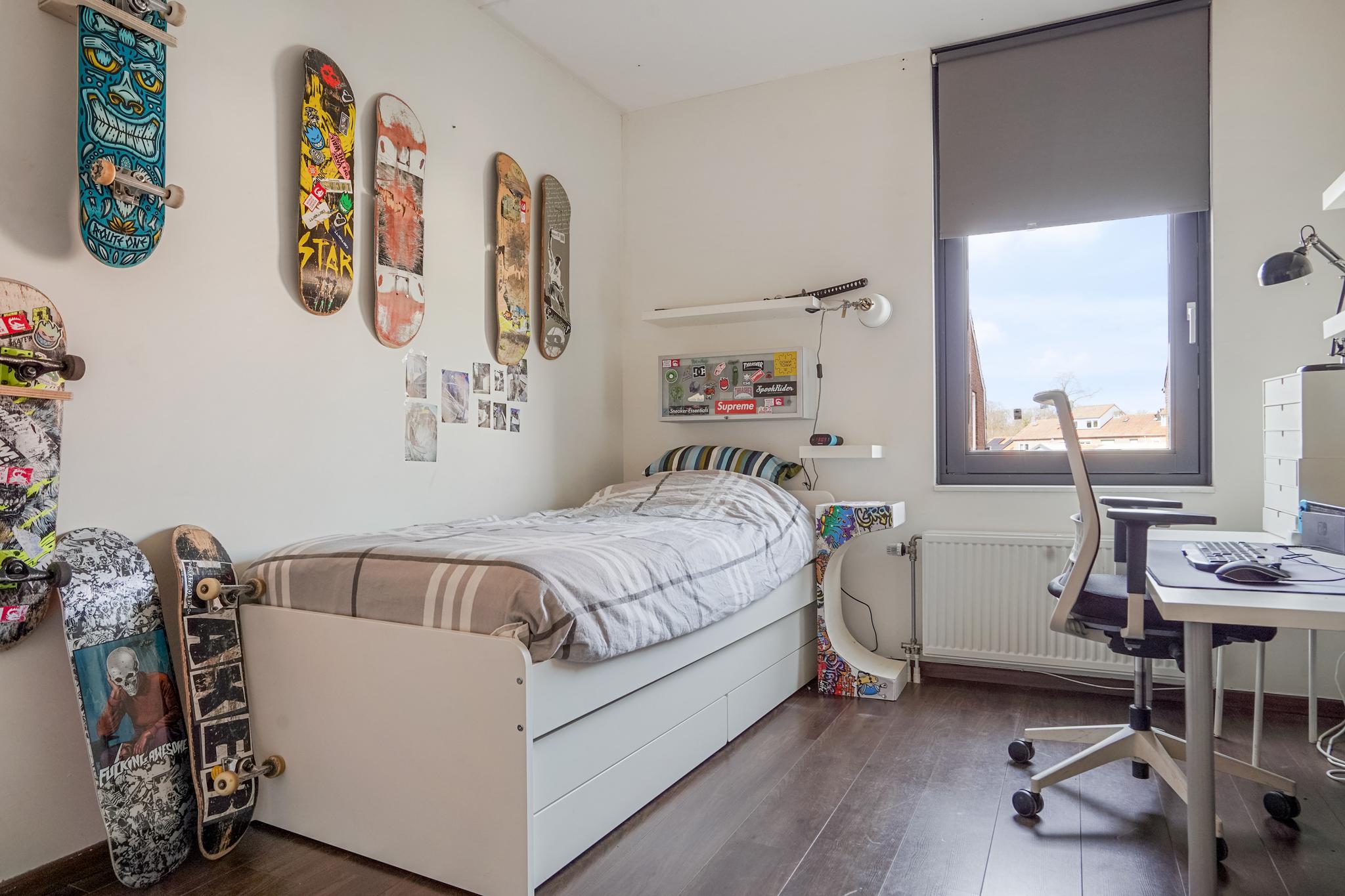 Slaapkamer 3 aan voorzijde is afgewerkt met een laminaatvloer, pleisterwerk (stuk) wanden en een spuitwerk plafond.