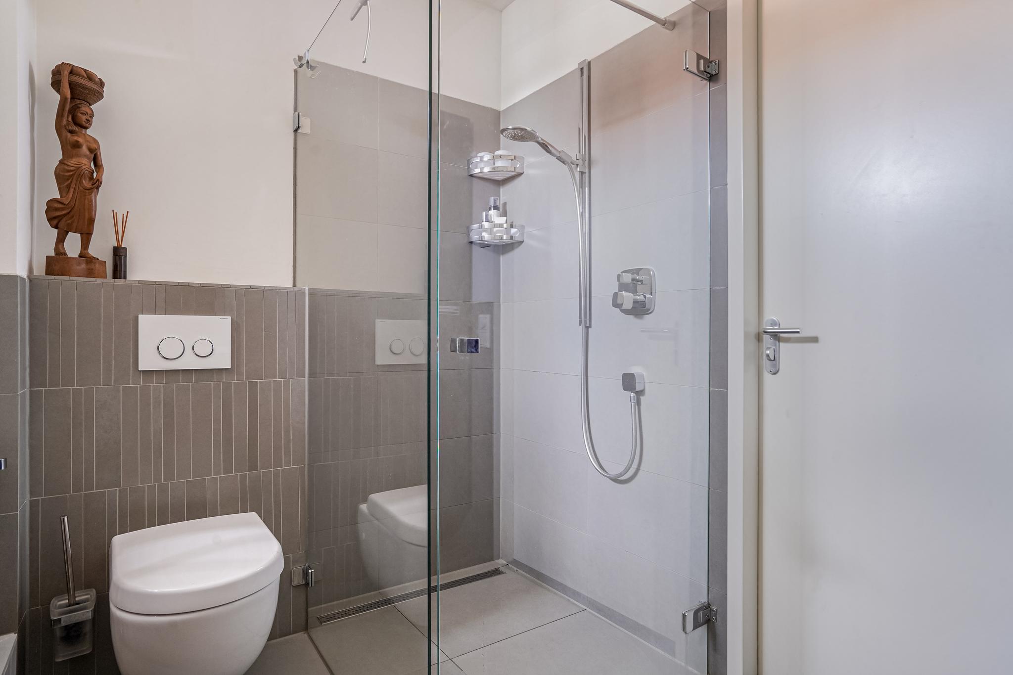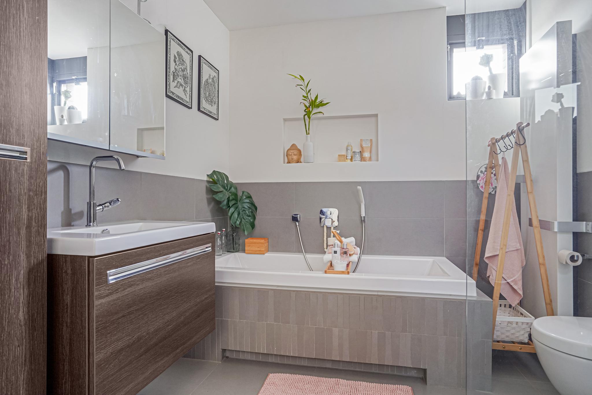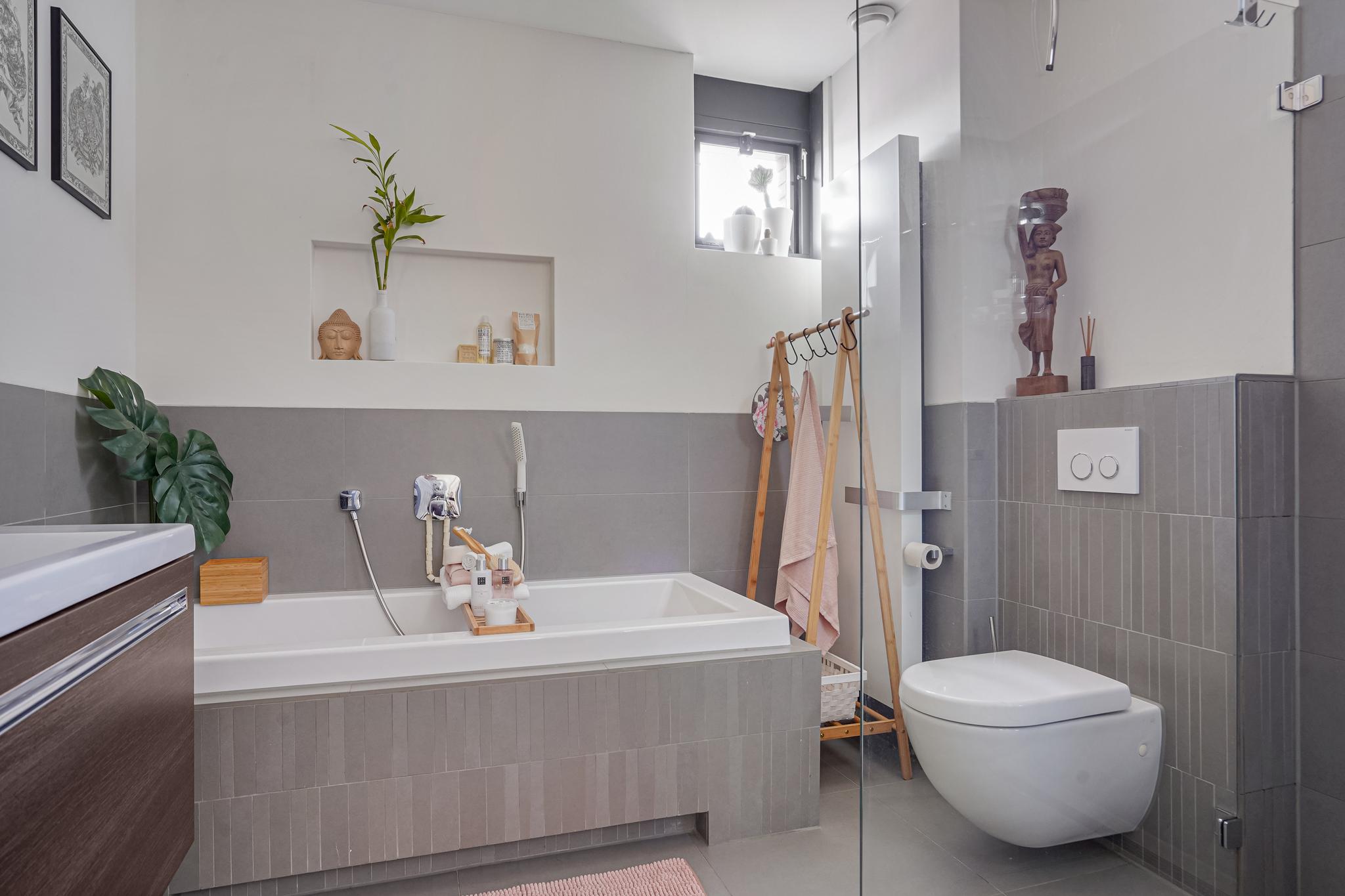 De luxe betegelde badkamer is voorzien van een badmeubel en geïntegreerde wastafel, design radiator, kunststof ligbad, zwevend closet, design kranen en een separate inloopdouche met thermostaatkraan.